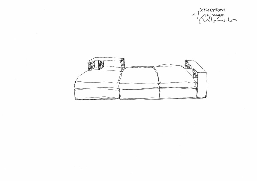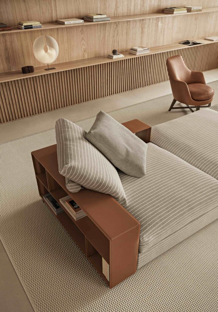 Que pode ser tradicionalmente estofado, ou com a forma de uma elegante consola metálica revestida a couro, com prateleiras para apoio e arrumação. Uma solução funcional, um gesto conceptual, uma referência subtil à obra de Donald Judd — um diálogo entre arte, proporção e domesticidade que Citterio prefere sugerir, sem necessidade de explicar.