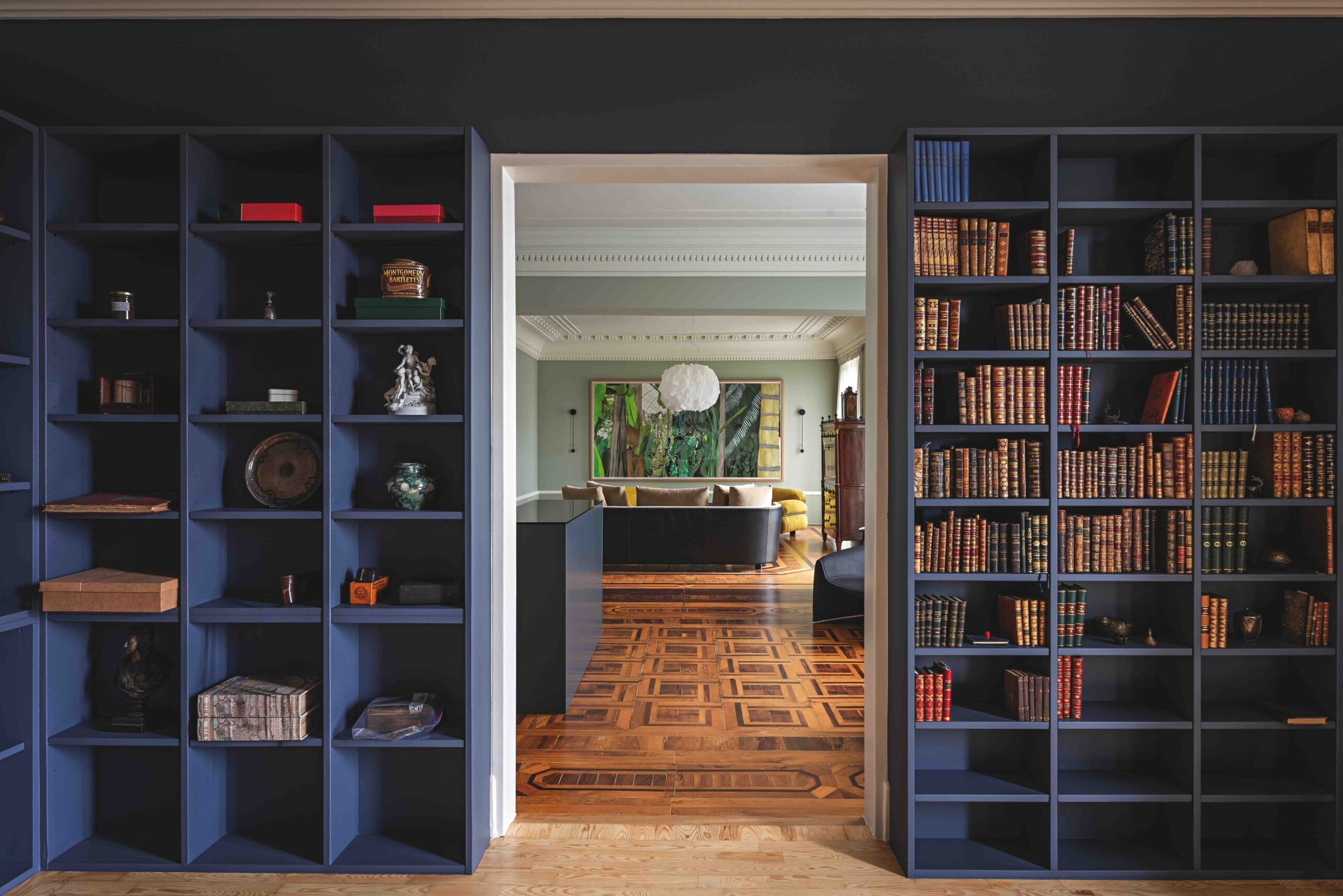 Estantes simétricas, muitas vezes usadas como estantes para biblioteca, completam projetos de decoração clássica, muitas vezes com molduras ou boiseries.
