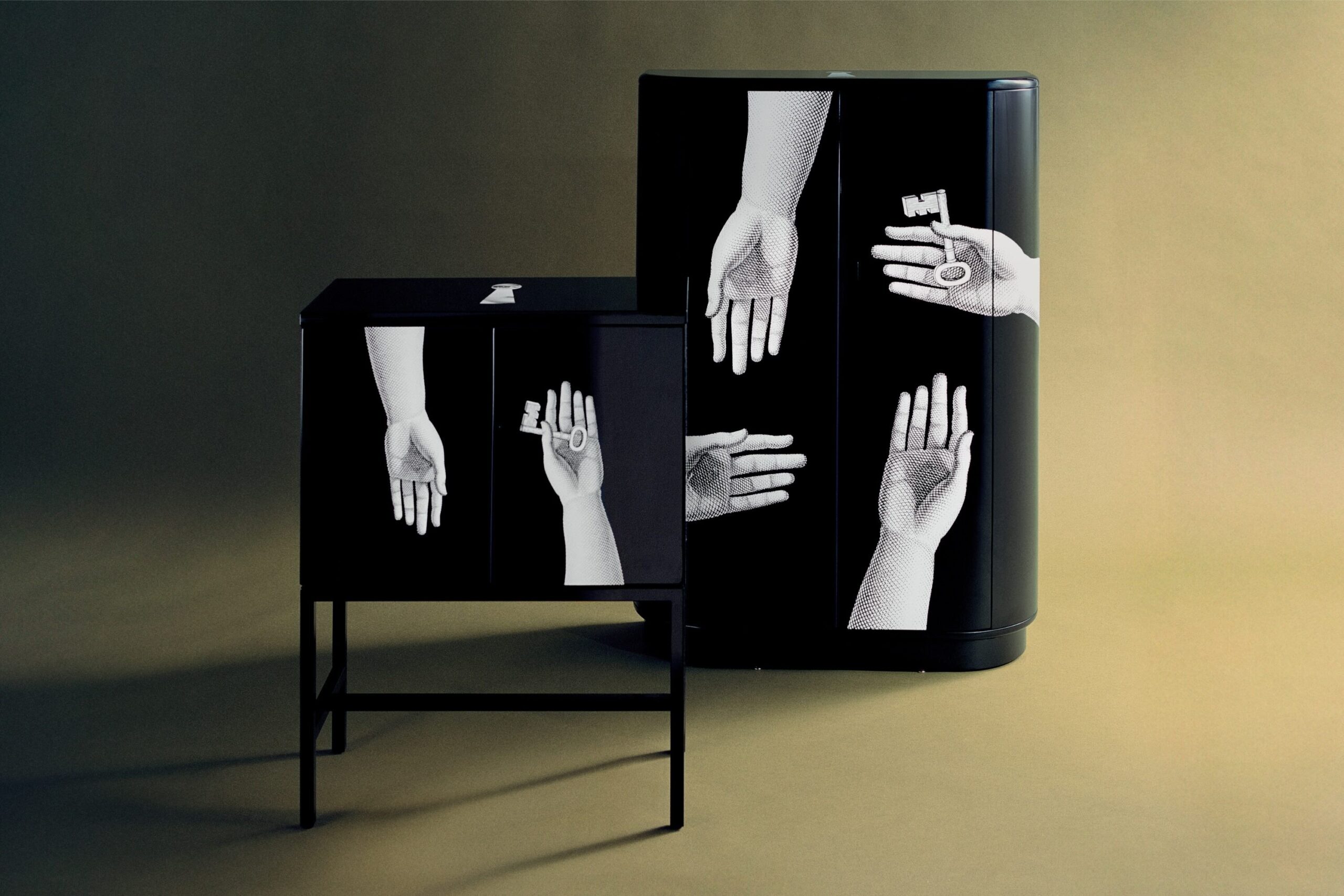 No segundo piso da loja, o novo móvel-bar Palladiana e Arlecchini interpreta o conceito de convivialidade doméstica, equilibrando sociabilidade e teatralidade. Nunca antes realizado, este objeto torna-se um palco para o quotidiano, acolhendo bebidas, objetos e histórias num jogo lúdico entre função e imaginação. A seu lado, um armário elevado, um stipo e uma consola estabelecem um diálogo visual, cada um decorado com motivos arquitetónicos, corujas ou mãos que seguram chaves e fechaduras, símbolos de mistério e curiosidade.