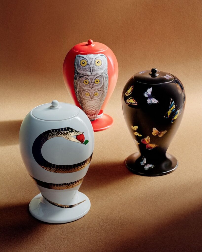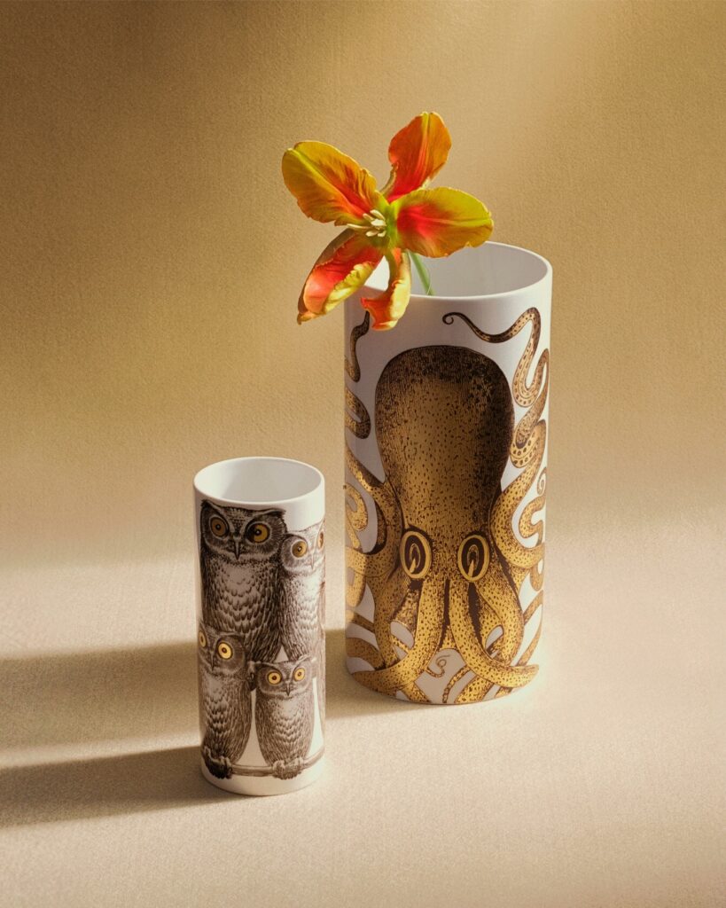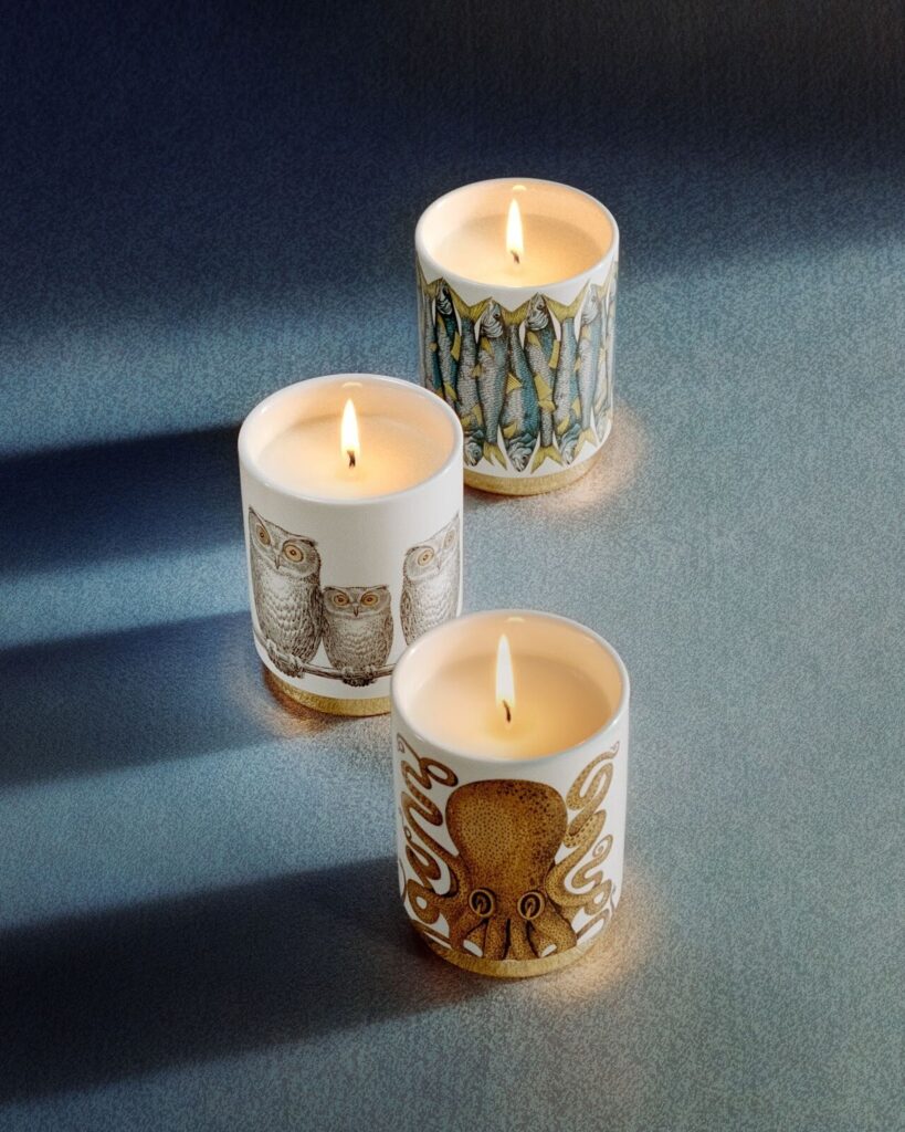 Este mesmo universo imaginativo ganha forma nas novas velas, peças únicas de coleção apresentadas durante a Milano Design Week. Produzidas em porcelana decorada à mão e enriquecidas com uma base dourada, são perfumadas com a Fragranza Immaginazione da Fornasetti. São introduzidos três novos motivos: civette (corujas), de presença elegante e expressão da visão noturna e fantástica do atelier; sardine (sardinhas), que deslizam de forma lúdica pela porcelana, celebrando a ironia marinha do imaginário Fornasetti; e o polipo (polvo), representado com detalhe refinado, transformando a vela num estudo de elegância fluida.