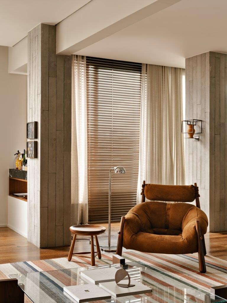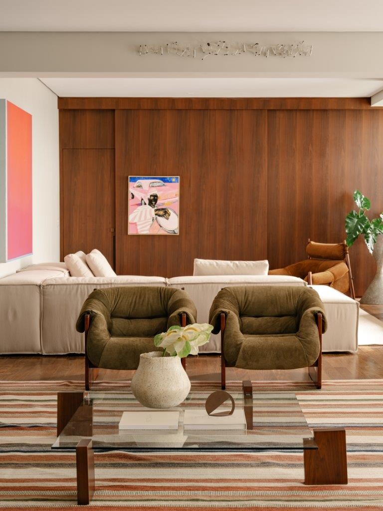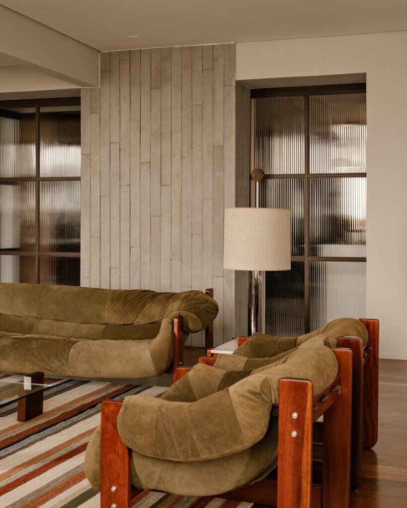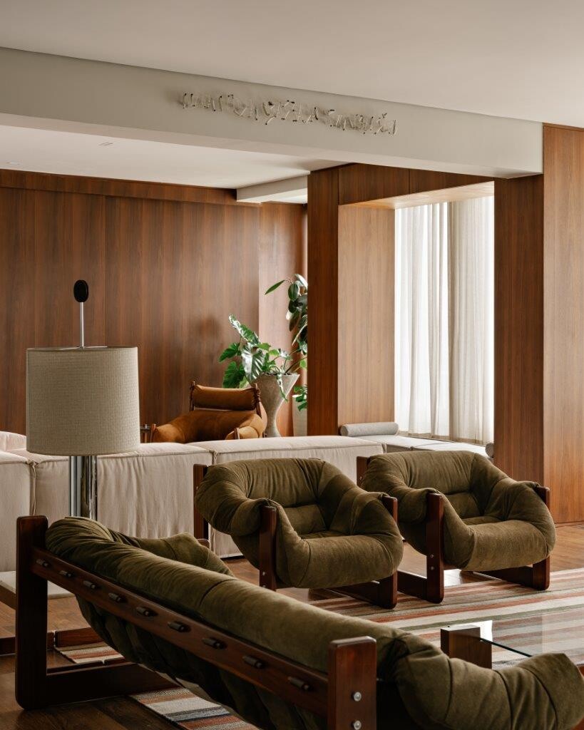Ao entrar na área de estar, a sensação de bem-estar é imediata. O modernismo brasileiro é um dos pilares do projeto, e o betão ganha destaque não apenas como elemento estrutural, mas também como expressão estética . O pavimento de madeira original foi mantido, criando uma harmonia natural com as vigas aparentes. O resultado é um conjunto acolhedor e cheio de personalidade.