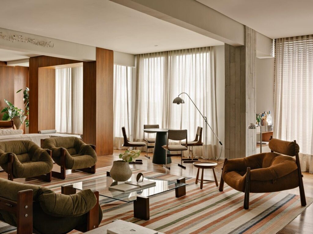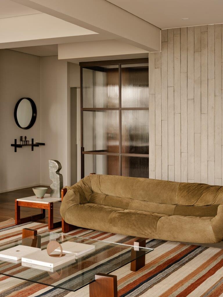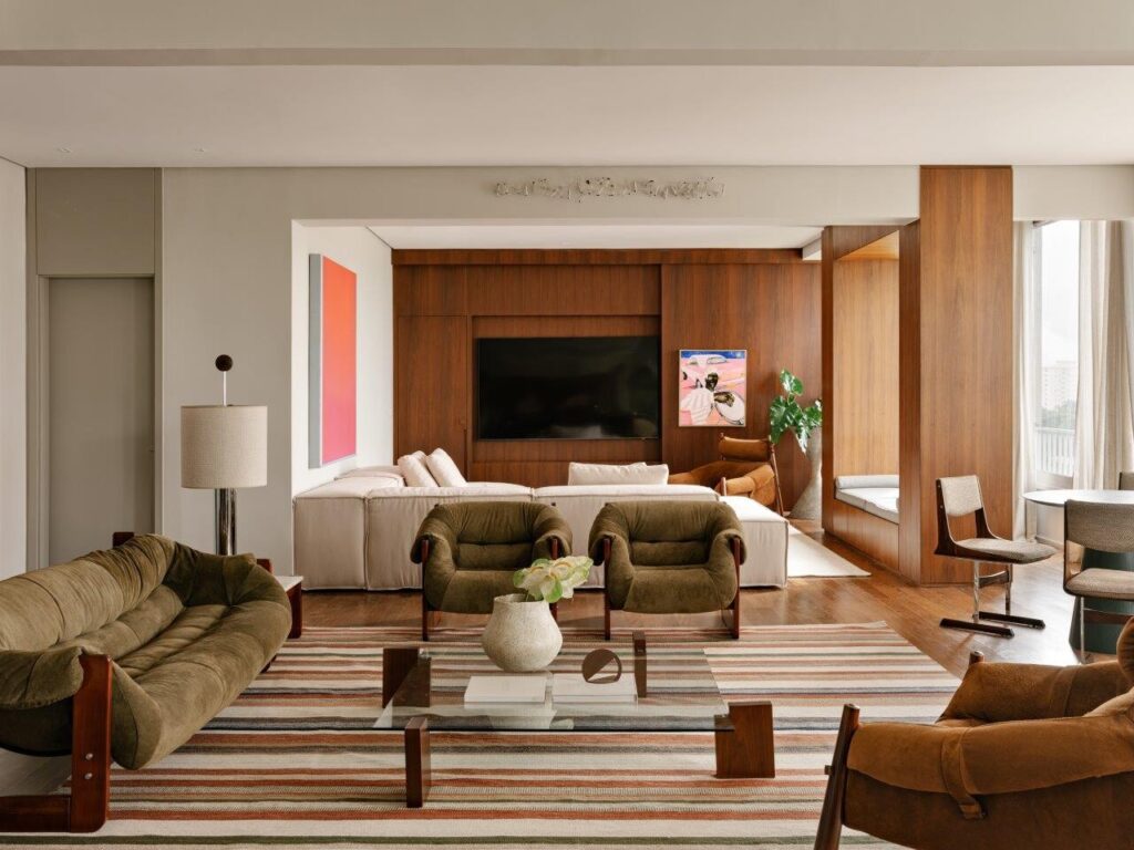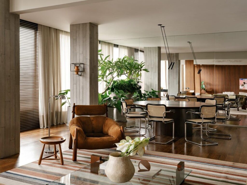 Ao entrar na área de estar, a sensação de bem-estar é imediata. O modernismo brasileiro é um dos pilares do projeto, e o betão ganha destaque não apenas como elemento estrutural, mas também como expressão estética . O pavimento de madeira original foi mantido, criando uma harmonia natural com as vigas aparentes. O resultado é um conjunto acolhedor e cheio de personalidade.