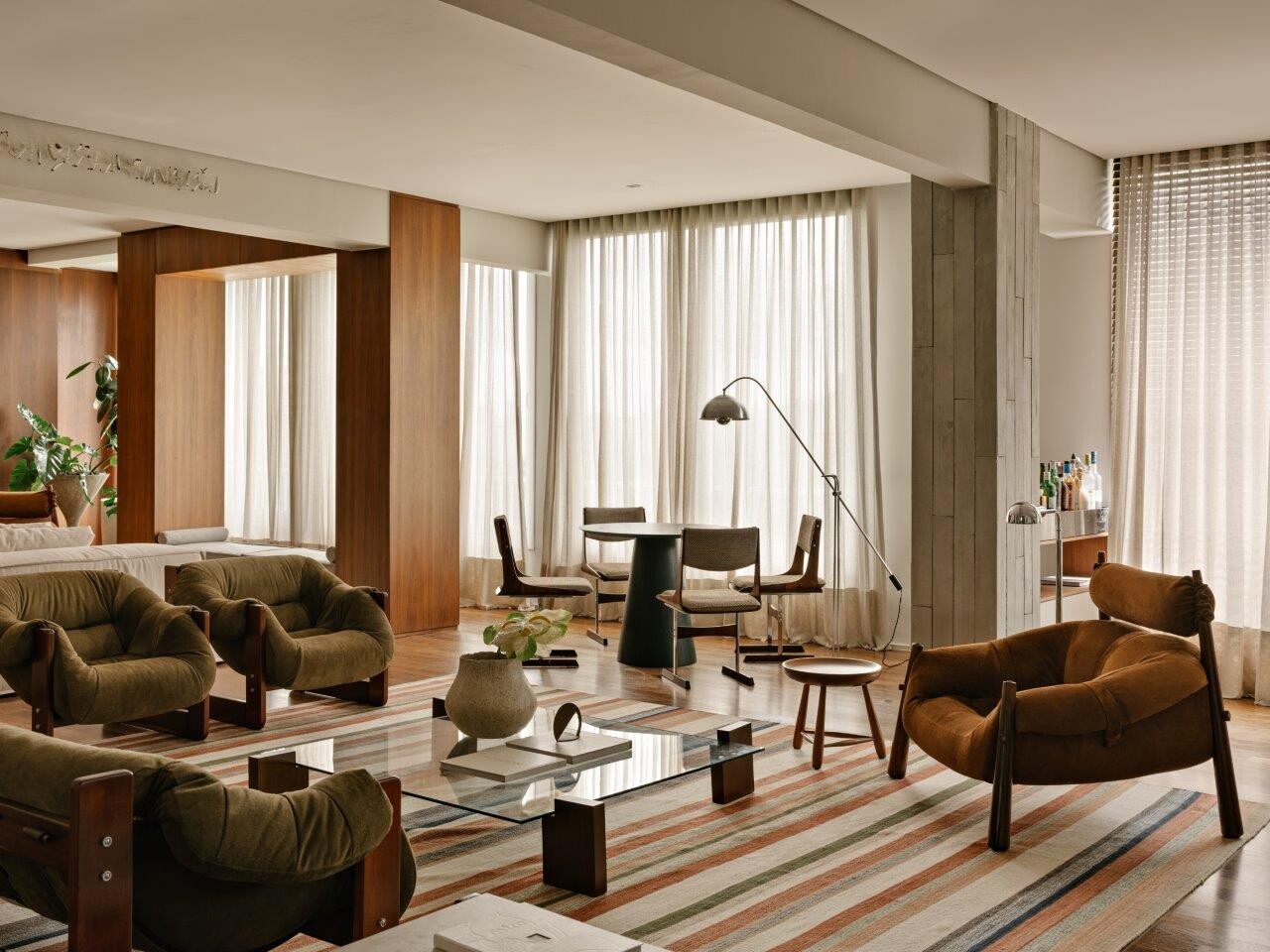 As amplas janelas voltadas para a Avenida Nove de Julho permitem que o verde das árvores se integre na decoração. A paleta de cores parte do tom da marcenaria original do pavimento e foi cuidadosamente pensada para criar uma relação fluida entre os acabamentos. A paleta inclui tons de verde, terracota, madeira e outras cores em pontos estratégicos.