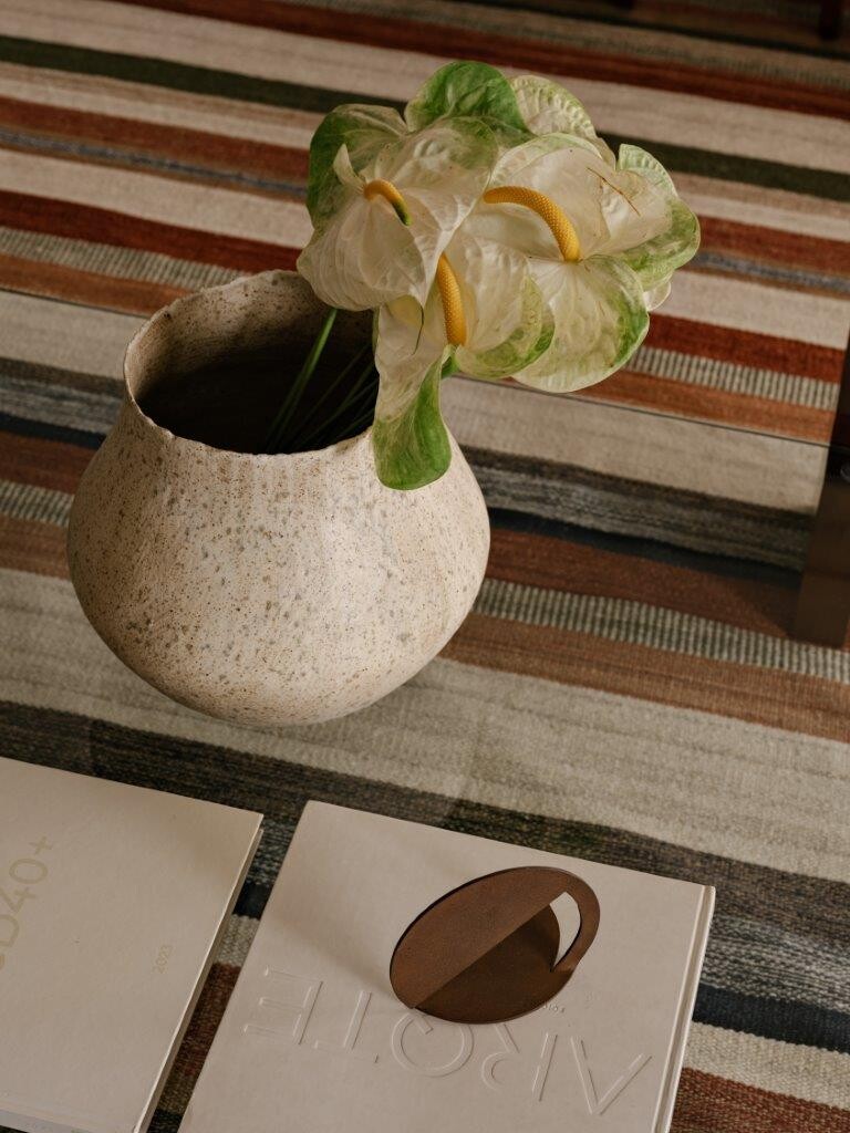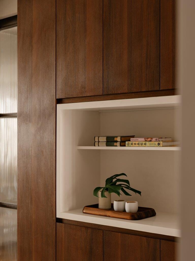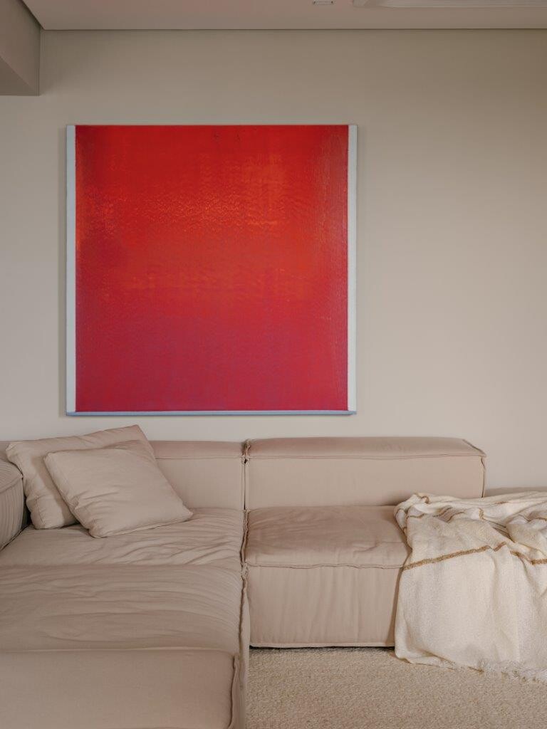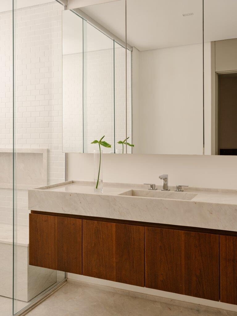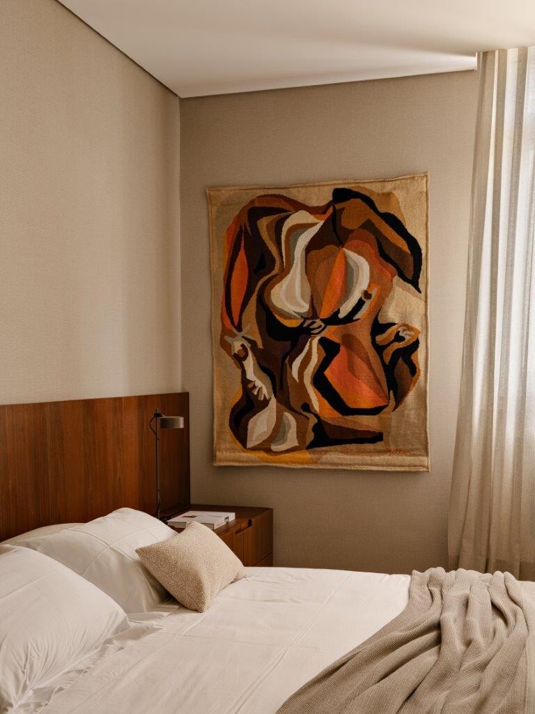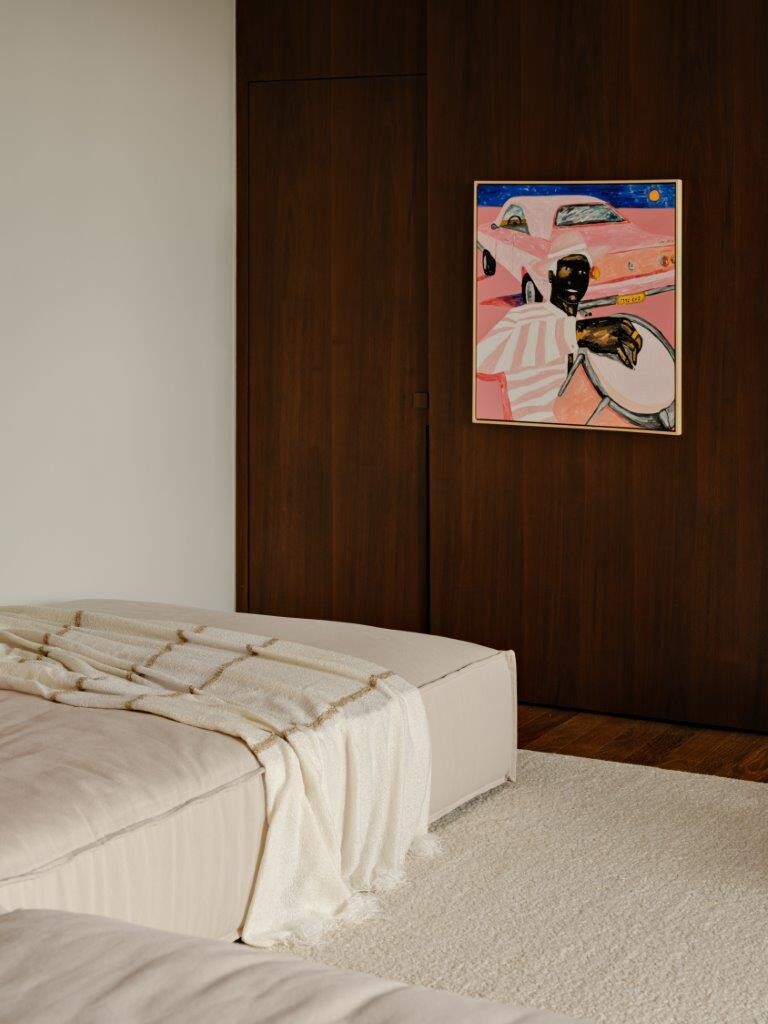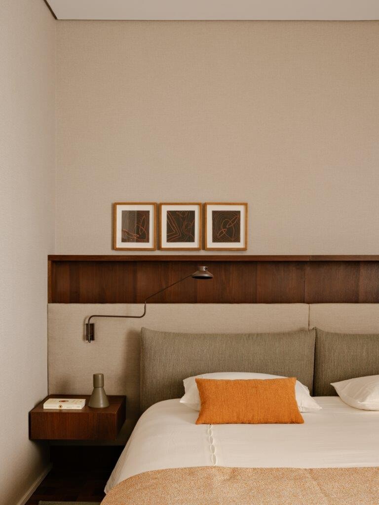 Na área reservada, o apartamento conta com uma suíte principal, uma suíte de hóspedes e um escritório que pode ser convertido num terceiro quarto, se necessário. Na suíte principal, a cabeceira da cama, desenhada pelo NJ+, traz um tom marcante na marcenaria, criando um contraste interessante com a atmosfera leve e neutra predominante no restante do ambiente.