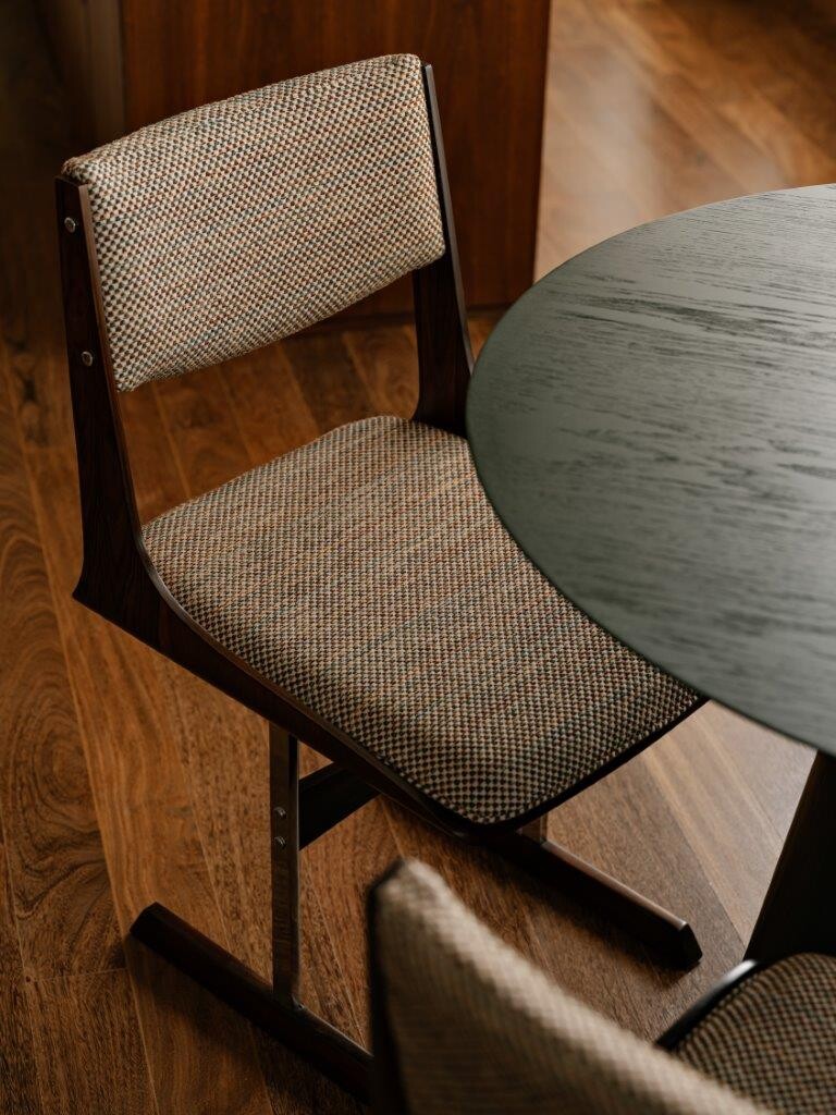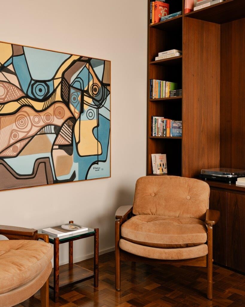 O morador, grande entusiasta do design brasileiro, reúne no espaço peças de nomes como Percival Lafer, Sérgio Rodrigues, Oscar Niemeyer e Jorge Zalszupin. São móveis de formas orgânicas, intemporais e extremamente confortáveis, que ocupam o ambiente com identidade e elegância.