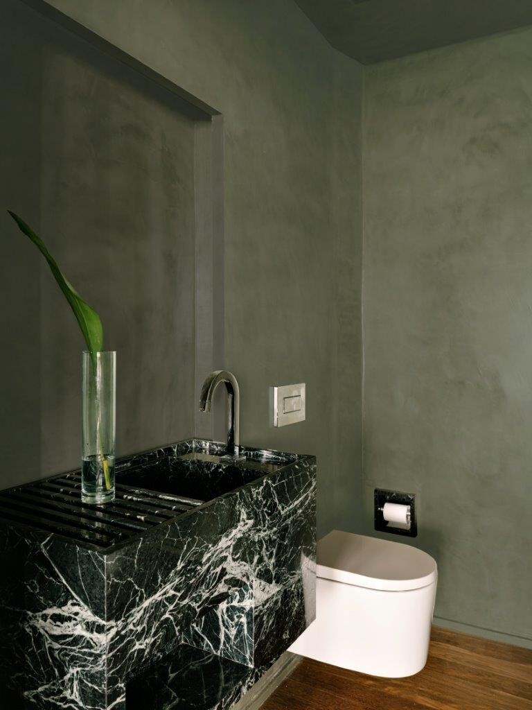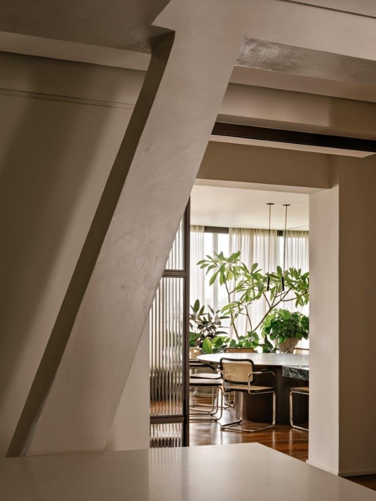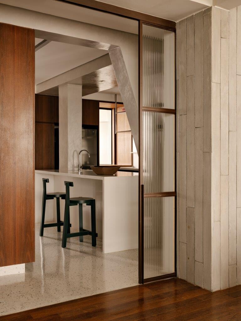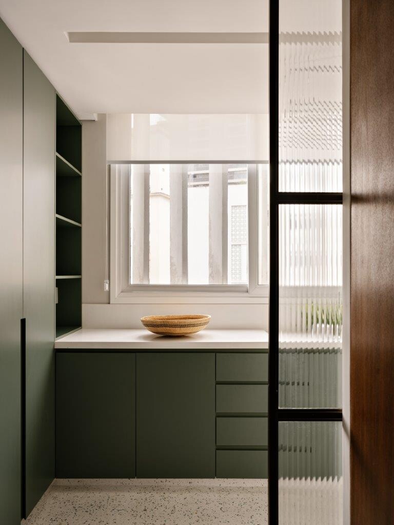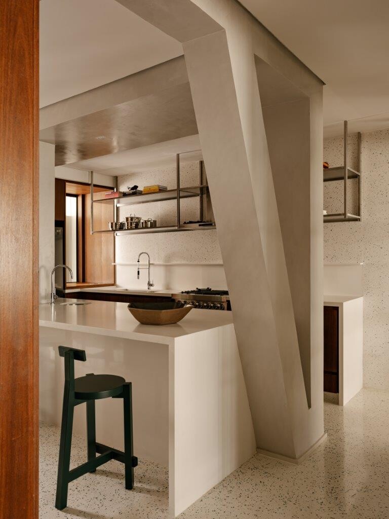 A pedido do cliente, a cozinha foi projetada para se integrar à sala de estar e à sala de jantar, com portas de vidro canelado que oferecem uma transparência subtil, ao mesmo tempo em que permitem fechar o espaço quando necessário. O ambiente segue uma linguagem mais clean, com destaque para as banquetas Girafa, assinadas por Lina Bo Bardi. Pavimento e paredes foram revestidos em granilite branco com pedrinhas verdes.