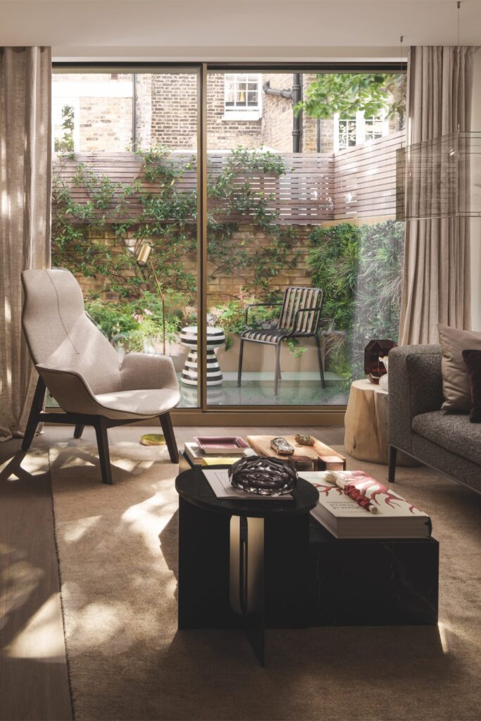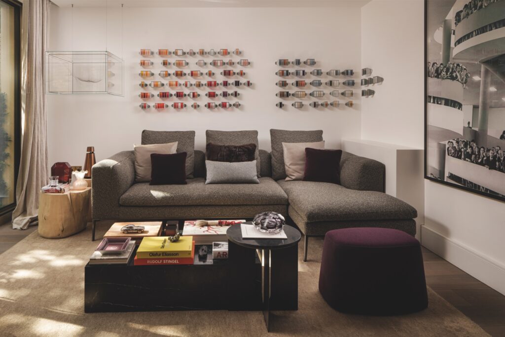 A zona de estar é elegante e funcional, marcada pelo sofá B&B Italia, pelo banco-pufe Maxalto, pela poltrona Poliform, pelas mesas Audo Copenhagen e Gervasoni 1882. O tapete da The Rug Company acrescenta textura e calor.