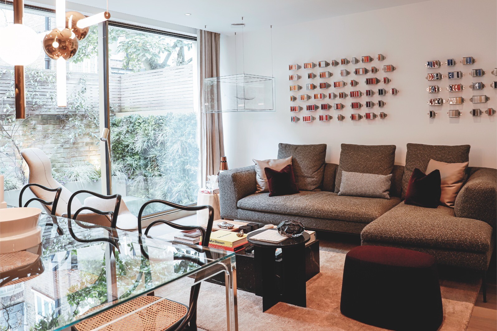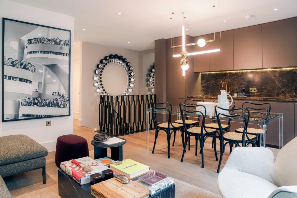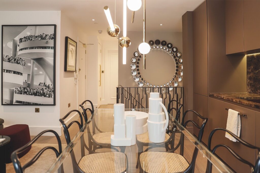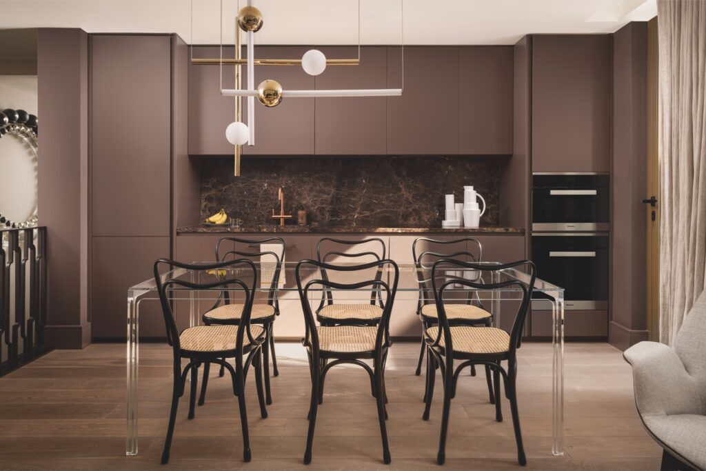 Na sala de jantar, a mesa GLAS Italia, as cadeiras Gebrüder Thonet Vienna e a luminária de Theo Lee Broom combinam-se com elegância. A cozinha, por seu turno, exibe marcenaria desenhada e feita sob medida.