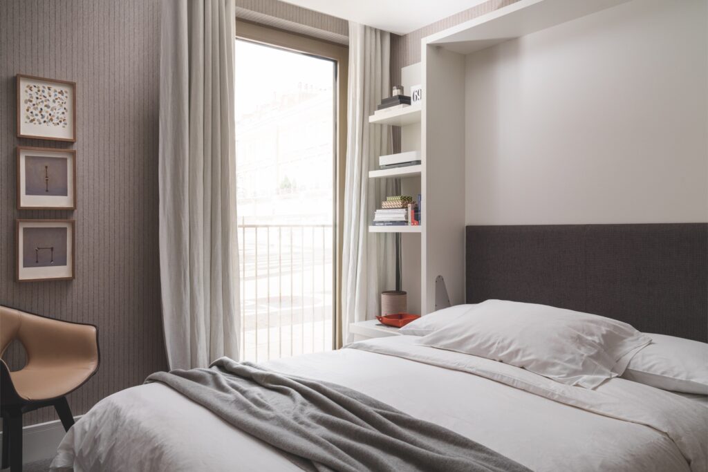No quarto principal, a cama, a poltrona e o banco são B&B Italia; o candeeiro de leitura é Tom Dixon e as mesas de cabeceira são da De La Espada. A iluminação original do apartamento foi preservada, com exceção de pequenos ajustes, caso dos pendentes e da luz indireta, que promovem uma atmosfera acolhedora e intimista.