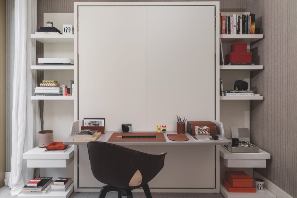 O quarto de visitas prossegue o mesmo discurso funcional e estético, com uma cadeira da Poltrona Frau e marcenaria sob medida.