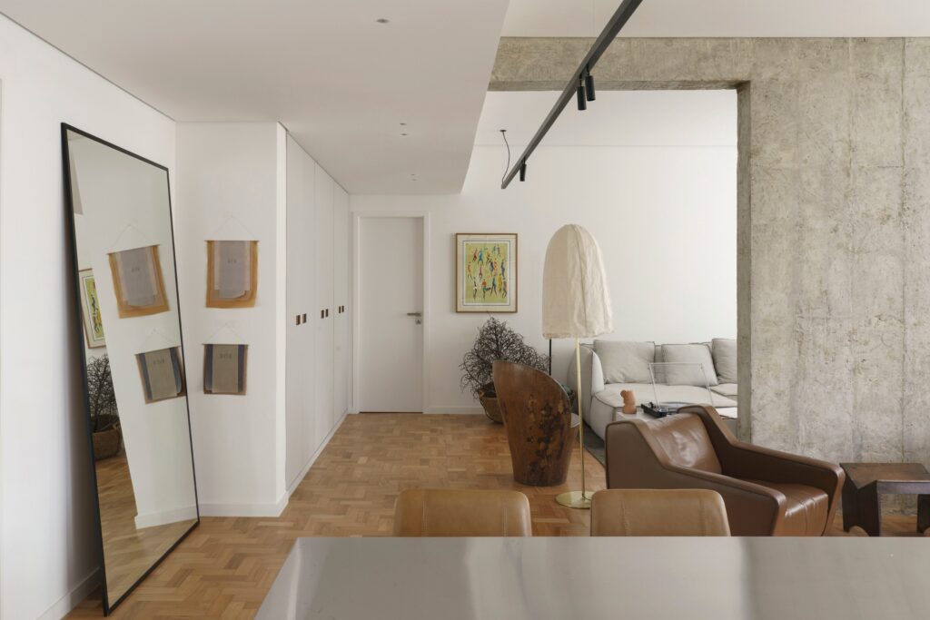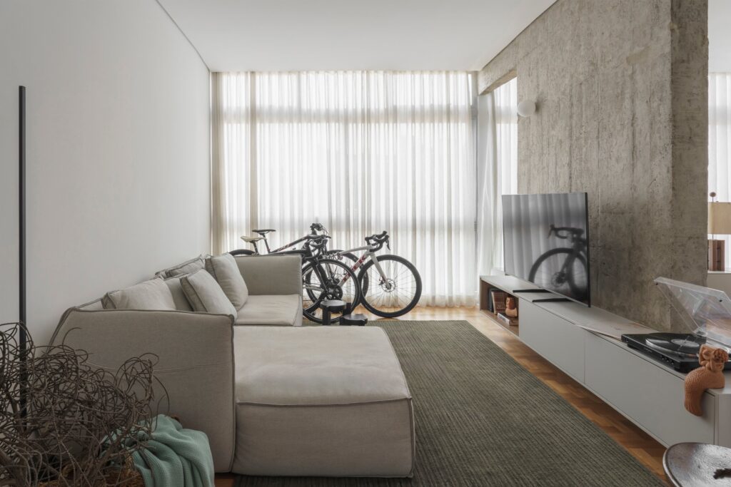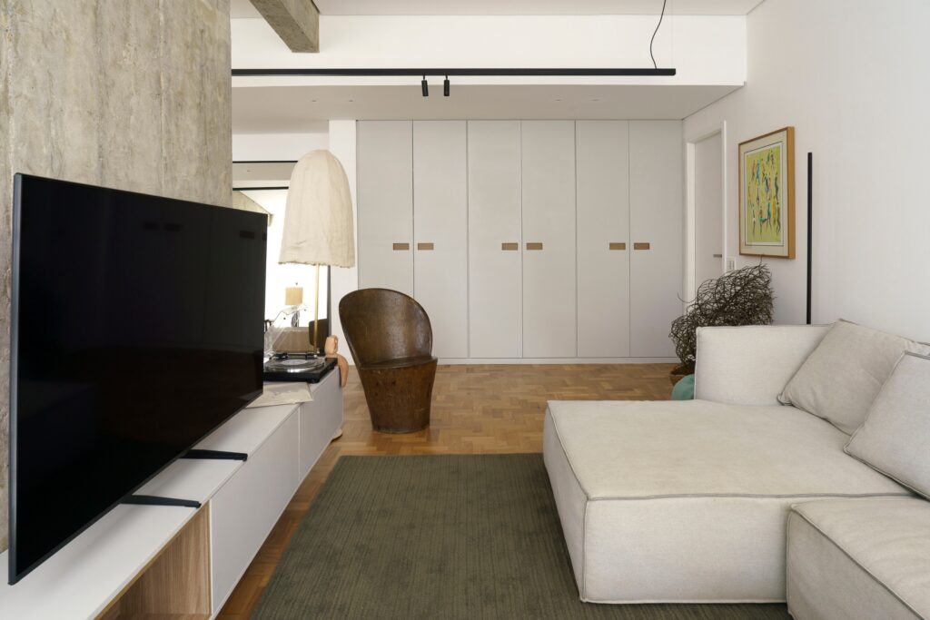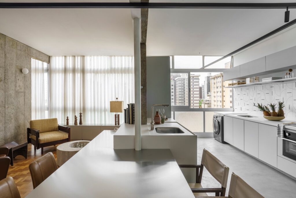 O imóvel foi adquirido por um casal de médicas anestesistas e o projeto foi encomendado após a compra. A planta original foi redesenhada para favorecer amplitude e fluidez. Um dos quartos foi eliminado para dar lugar a uma sala de TV conectada à área social, enquanto cozinha e área de serviço passaram a comunicar diretamente com os espaços de estar e jantar. “A remodelação removeu praticamente todas as divisórias interiores, mantendo apenas a estrutura original do edifício”, diz Piacesi. Após as intervenções, o apartamento passou a contar com cozinha, área de serviço e ambientes de estar, jantar e TV integrados, além de lavabo e suíte principal.