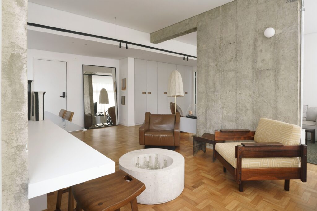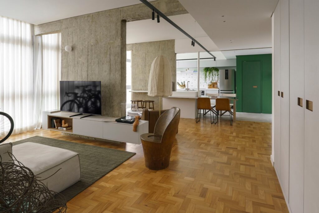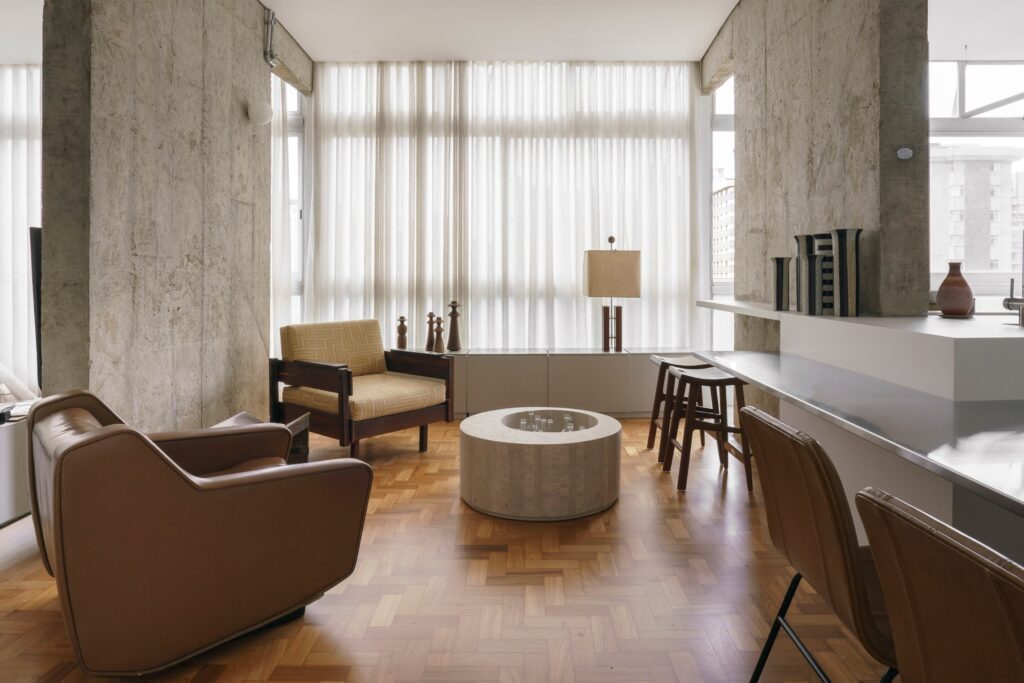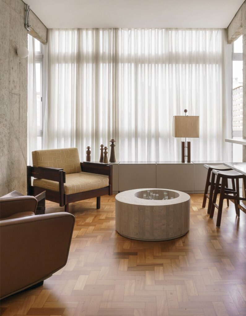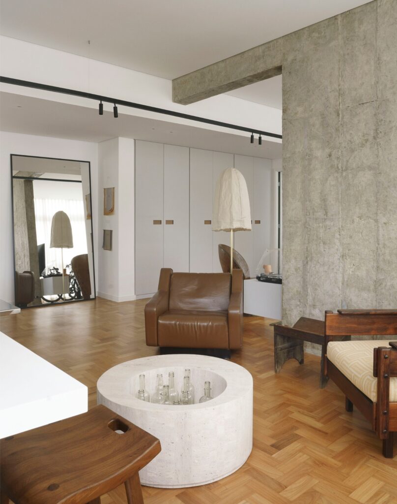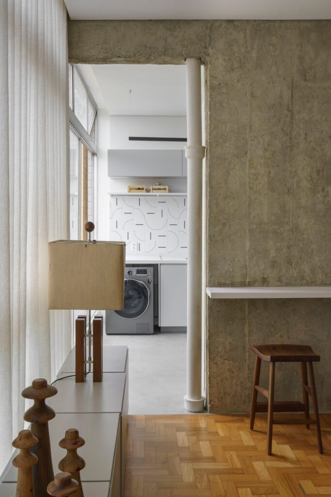 A paleta reúne tons terrosos presentes na madeira do piso original em taco, nas banquetas, banquinhos, poltronas e objetos, que combinam com os estofos castanhos e nuances de verde. O conjunto é equilibrado pelo cinzento das vigas e pilares aparentes, do cimento queimado da cozinha, da cuba do lavabo, da bancada de refeições em aço inox, dos revestimentos da casa de banho da suíte e do armário da sala. “A proposta foi criar um refúgio urbano no qual elementos naturais dialogam com gestos mais brutalistas, como a estrutura em betão aparente em contraste com o aço inox da bancada de refeições”, explica o arquiteto.