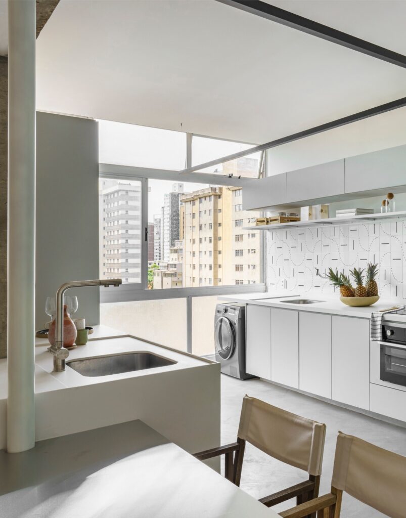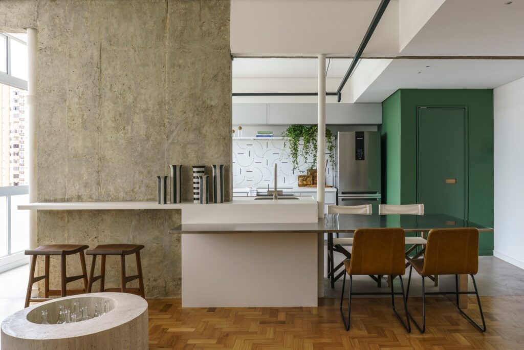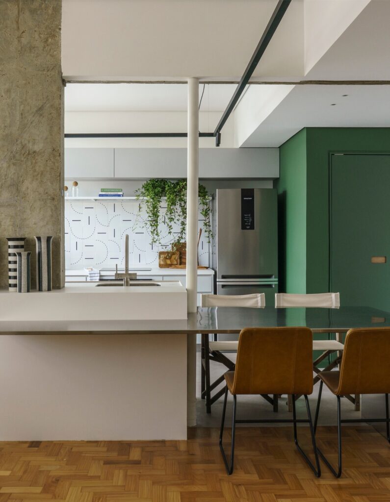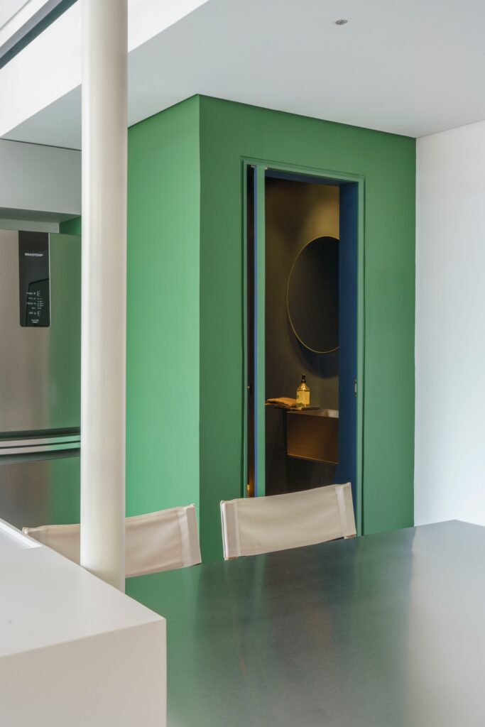 Entre os destaques estão o lavabo concebido como uma “caixa” verde — com paredes, teto e porta no mesmo tom —, a bancada de refeições em aço inox engastada na ilha da cozinha e a mesa de centro redonda desenhada pelo escritório e executada em mármore travertino, que também funciona como cooler. Chamam a atenção ainda o hall de acesso ao quarto, pintado no mesmo verde do acabamento do armário para reforçar o efeito de caixa, e o azulejo de motivo geométrico modernista na parede de fundo da cozinha, responsável por introduzir cor, ritmo e um toque poético ao ambiente.