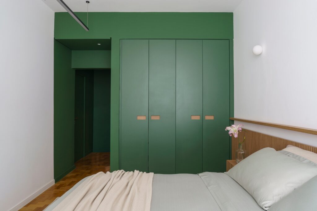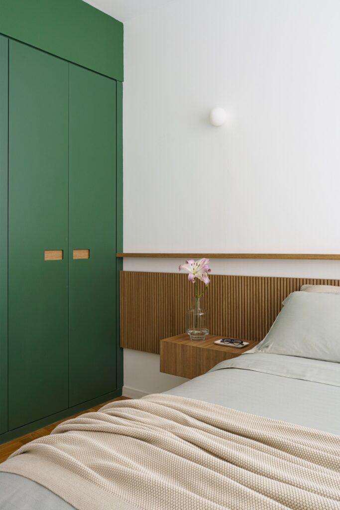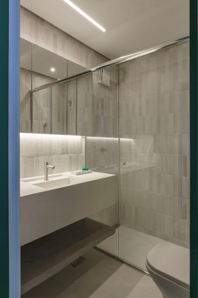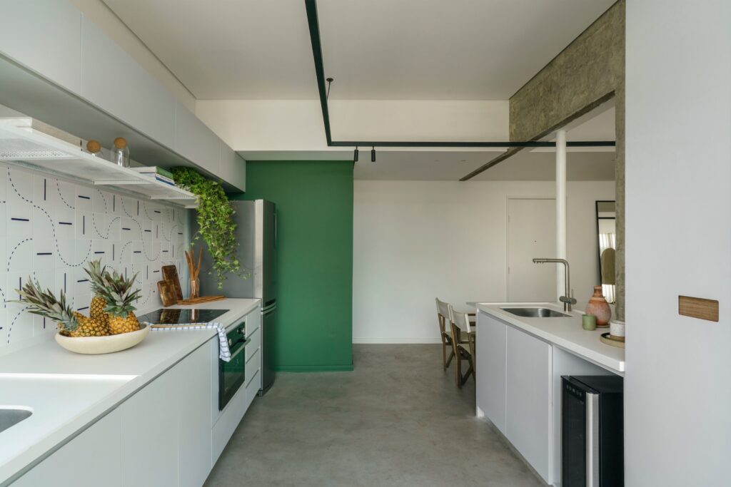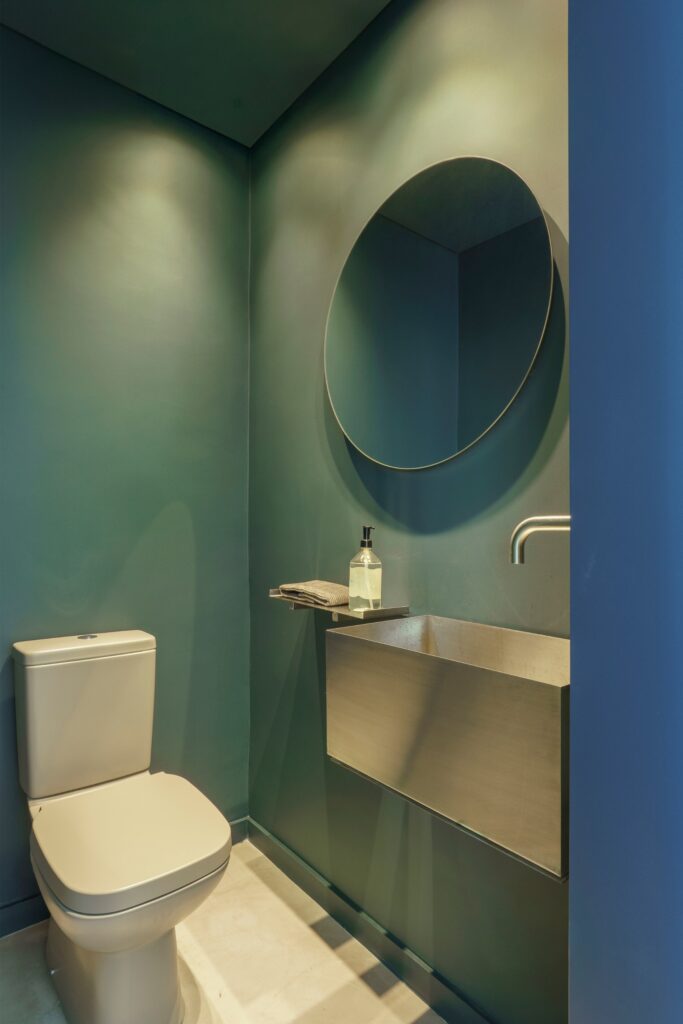 Entre os destaques estão o lavabo concebido como uma “caixa” verde — com paredes, teto e porta no mesmo tom —, a bancada de refeições em aço inox engastada na ilha da cozinha e a mesa de centro redonda desenhada pelo escritório e executada em mármore travertino, que também funciona como cooler. Chamam a atenção ainda o hall de acesso ao quarto, pintado no mesmo verde do acabamento do armário para reforçar o efeito de caixa, e o azulejo de motivo geométrico modernista na parede de fundo da cozinha, responsável por introduzir cor, ritmo e um toque poético ao ambiente.