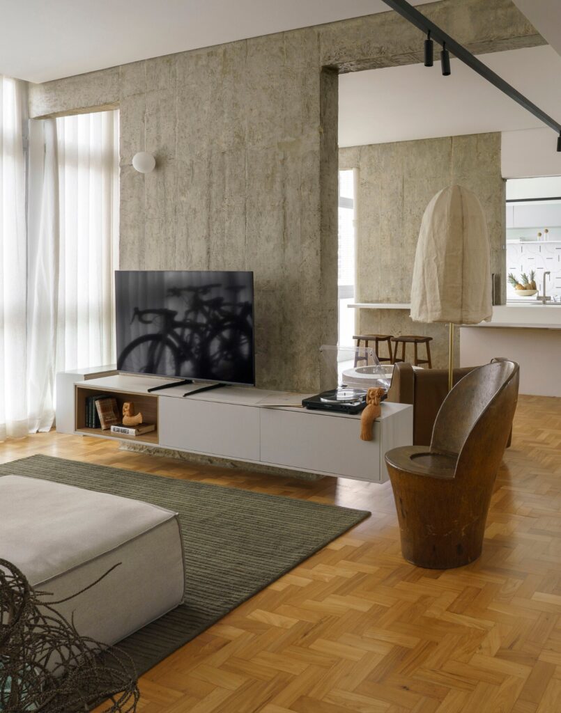 A integração dos espaços foi o ponto de partida do conceito, pensado para tornar o apartamento mais iluminado, ventilado e contínuo. Na estética, as moradoras procuravam uma atmosfera de brasilidade, evocando referências da Bahia sem abdicar de um certo minimalismo.