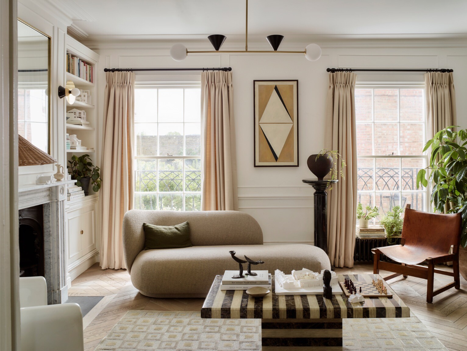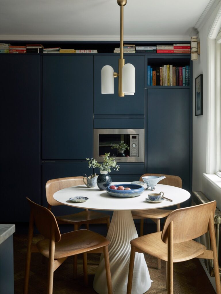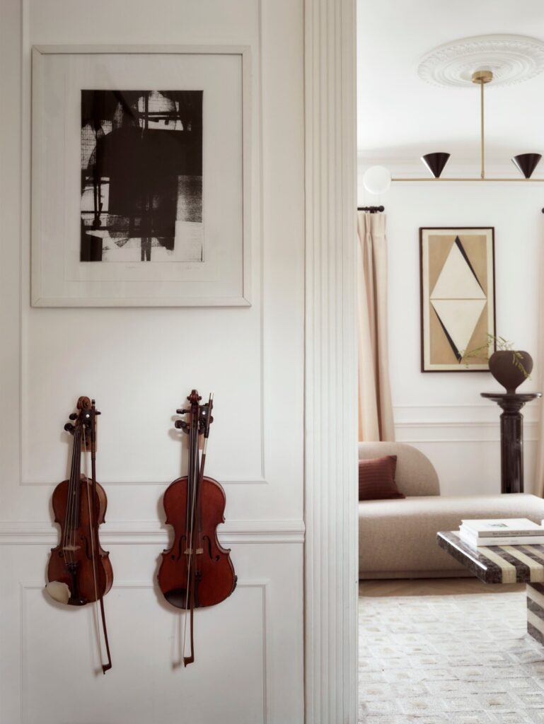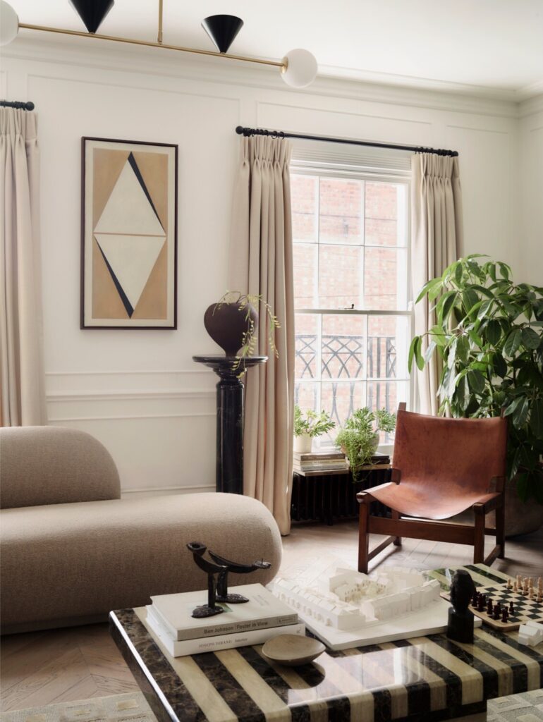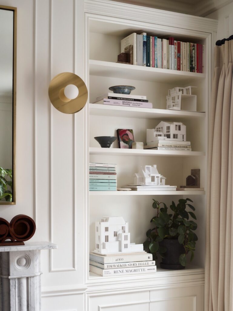 Ao longo do tempo, a casa tinha sido profundamente descaracterizada. Quase nada de original permanecia, à exceção de duas belas portas duplas entre as divisões do primeiro piso. Havia sancas dos anos 1980, pavimentos sintéticos que imitavam madeira, lareiras tapadas e alcatifas. Assim, a primeira tarefa não foi introduzir algo novo, mas antes repor aquilo que deveria sempre ter estado ali. “Investigámos casas georgianas na zona e reintroduzimos cuidadosamente sancas, rosetas de teto, lareiras e ferragens adequadas à época”. Uma vez restabelecida essa estrutura histórica, a questão passou a ser como viver nela enquanto família de quatro.