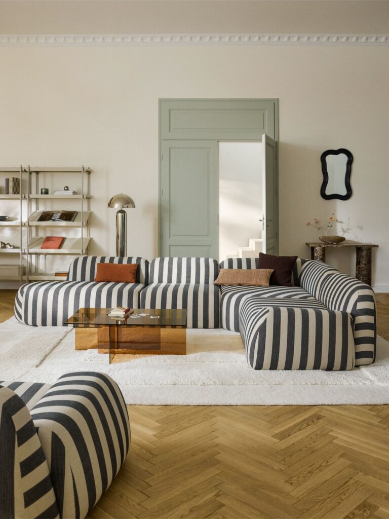 Visualmente imponente, o WOLKE revela ainda uma natureza transversal e intemporal, na medida em que a sua estrutura modular lhe permite adaptar-se a diferentes conceitos de decoração, mantendo sempre uma identidade forte. Disponível numa seleção criteriosa de cores e texturas premium — do bouclé suave aos tecidos aveludados e materiais de fácil manutenção —, o sofá ganha agora uma nova dimensão com a introdução de um padrão de riscas. Este elemento gráfico redesenha as suas curvas, conferindo-lhe uma presença arquitetónica ainda mais singular.