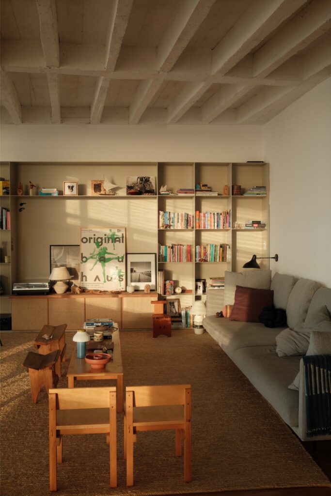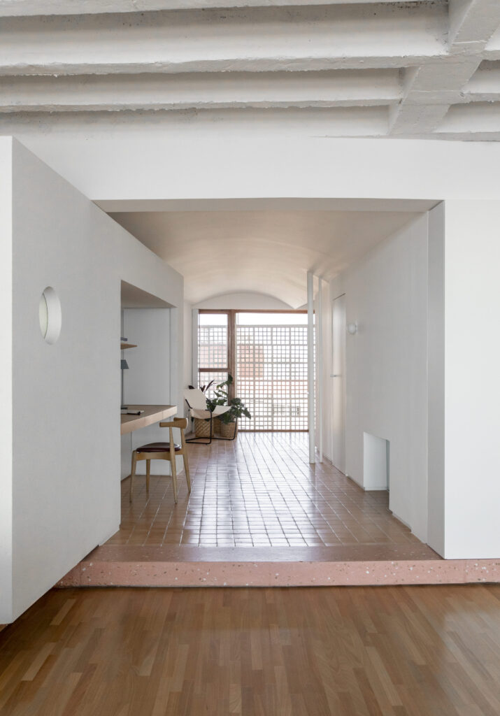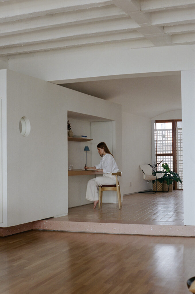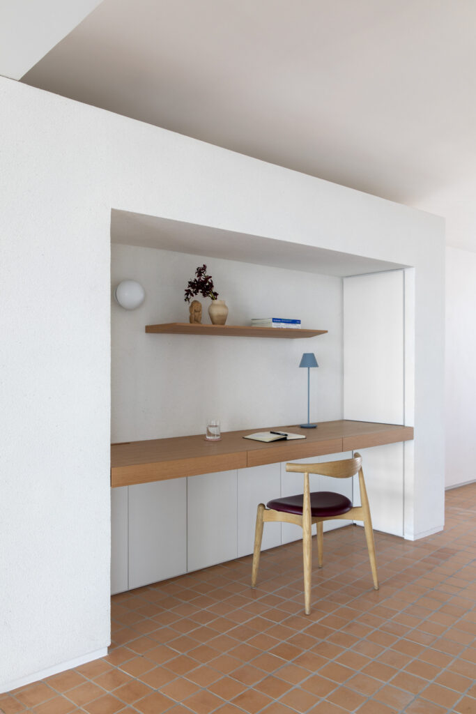 A estratégia espacial ganha ainda mais força com a criação de um plano elevado: o piso sobe 18 centímetros e recebe placas de betão pré-fabricado, desenhadas segundo o ângulo da própria fachada. Esta intervenção reforça a mudança de uso dos ambientes e introduz um jogo de níveis que dinamiza a circulação. O escritório, implantado no antigo espaço da cozinha, projeta-se parcialmente sobre este plano, criando a sensação de leveza e suspensão.