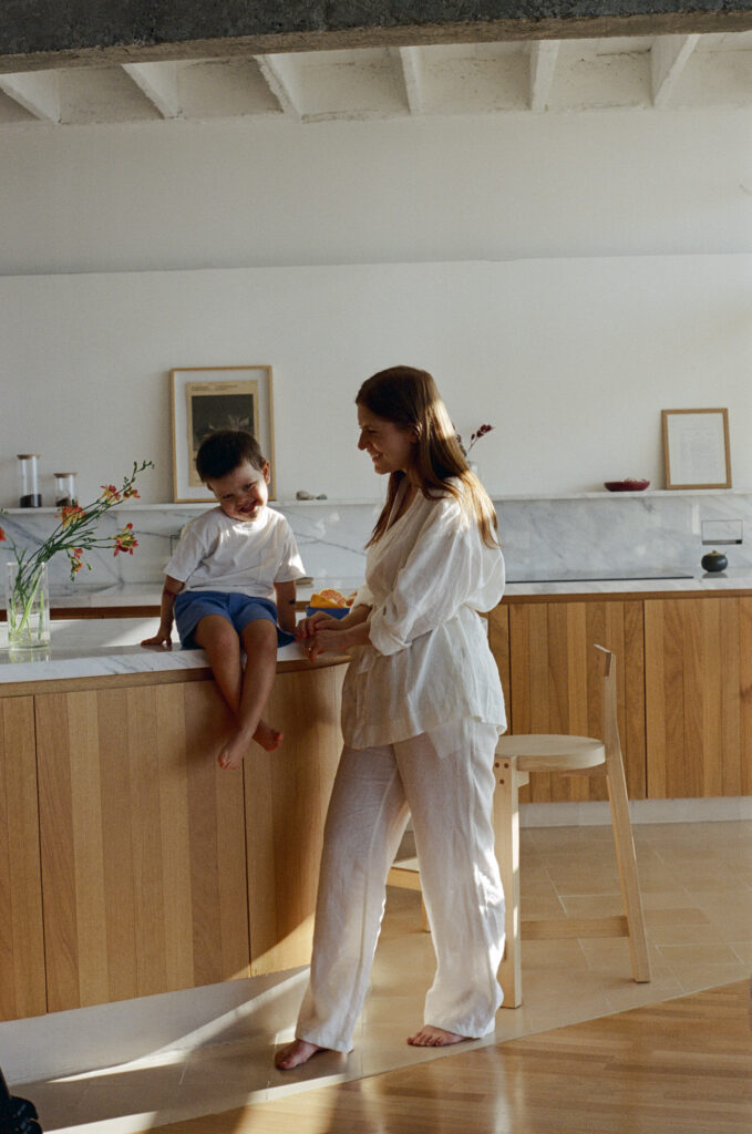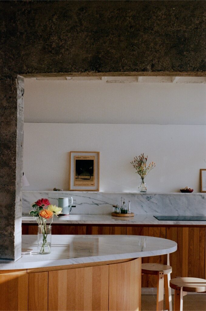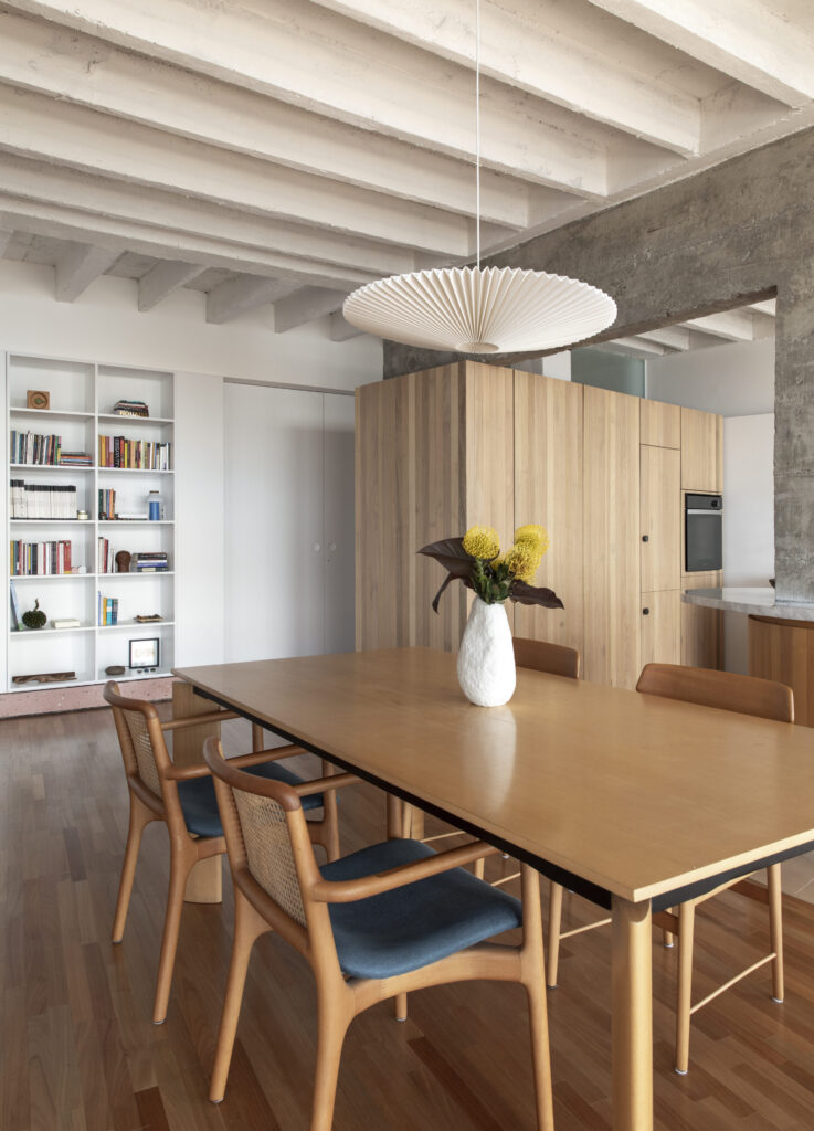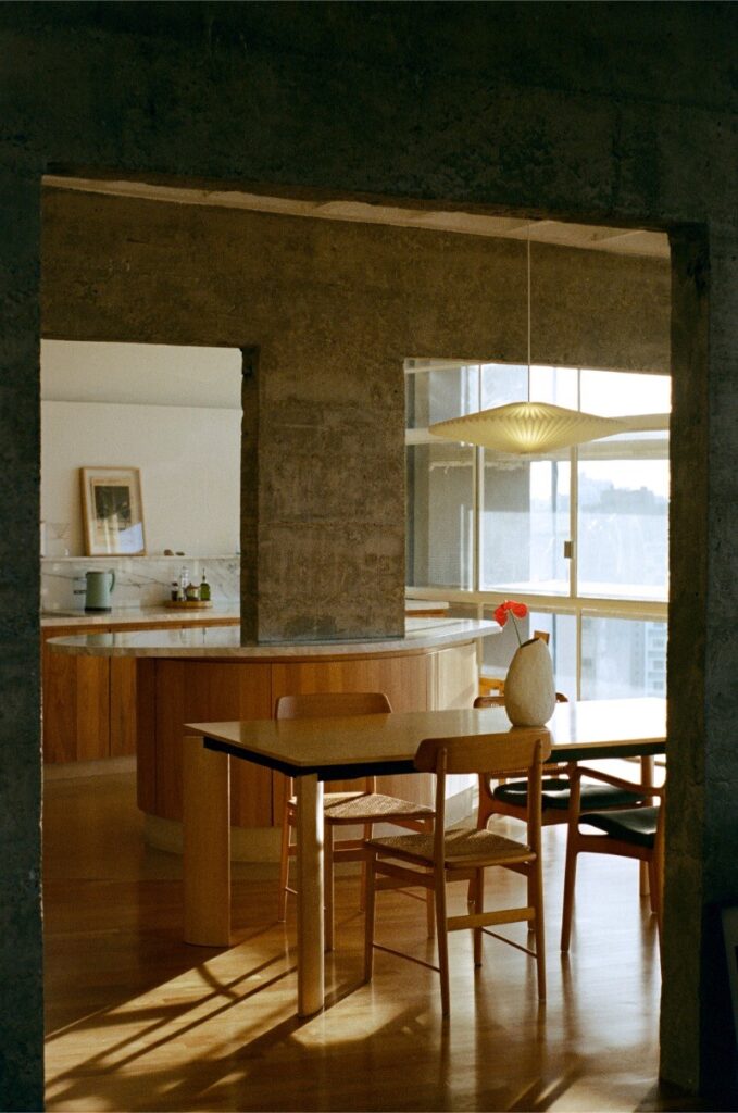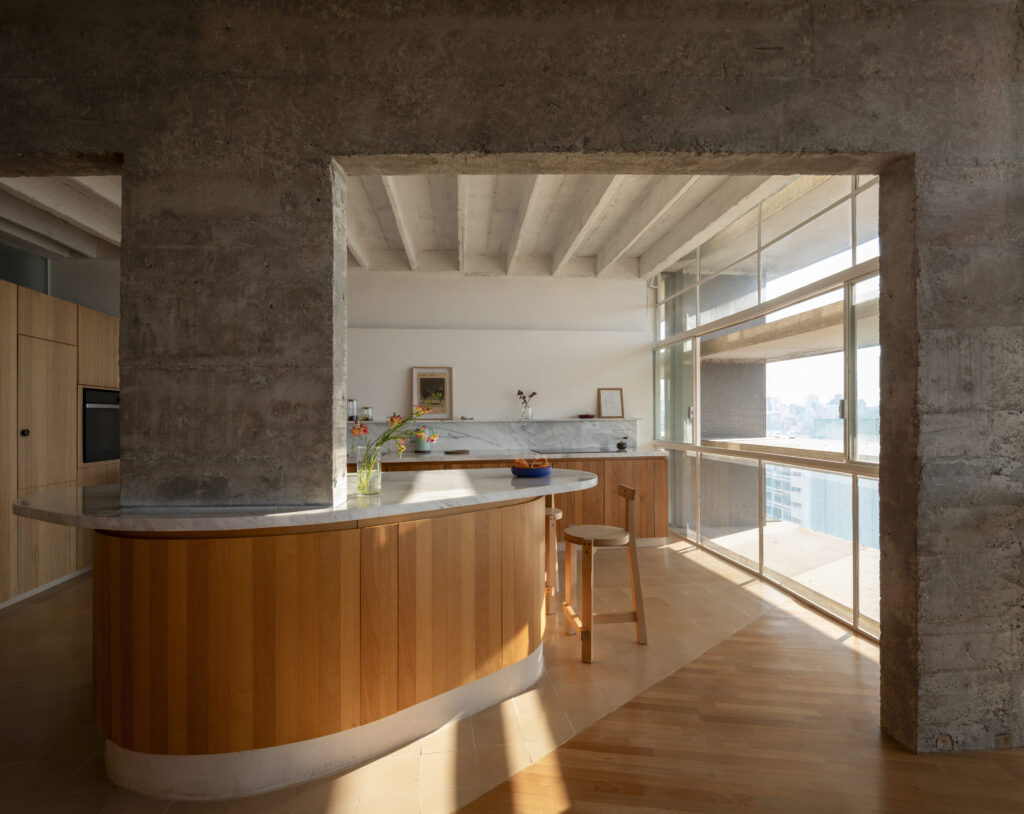 É nesse perímetro privilegiado que acontece a principal inversão de lógica: onde antes havia um quarto, surge agora a cozinha — assumida como coração da casa. Executada em madeira tauari maciça, a bancada de cocção e a ilha recebem tampo em mármore Espírito Santo, num desenho orgânico que abraça um dos pilares estruturais. Ao ultrapassar o eixo desses elementos, o gesto dissolve limites e reforça a continuidade espacial entre cozinhar, receber e habitar.