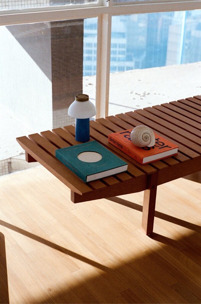 A antiga organização do apartamento cede lugar a uma nova narrativa doméstica. O quarto central transforma-se em sala de jantar, enquanto, na outra extremidade da fachada, a sala de estar e a biblioteca — desenhada em chapas metálicas — organizam-se em torno da paisagem. A essa altura, a cidade revela-se em camadas: não há ruas ou movimento imediato, apenas a sobreposição de edifícios de diferentes épocas e, ao fundo, a presença constante da Serra da Cantareira.