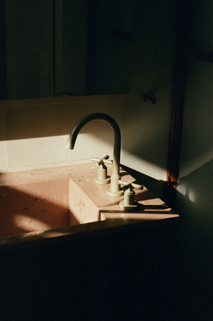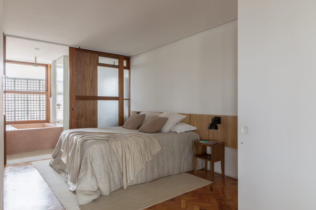 A paleta é contida e precisa: madeira tauari, betão — ora original, ora pigmentado em branco e rosa — e pedra natural compõem uma base sensorial que equilibra um lado mais cru com outro mais sofisticado. A marcenaria, integralmente em madeira maciça, contribui para tornar os espaços mais acolhedores.