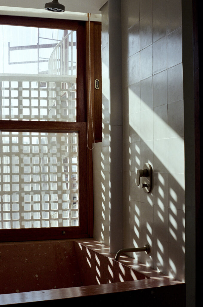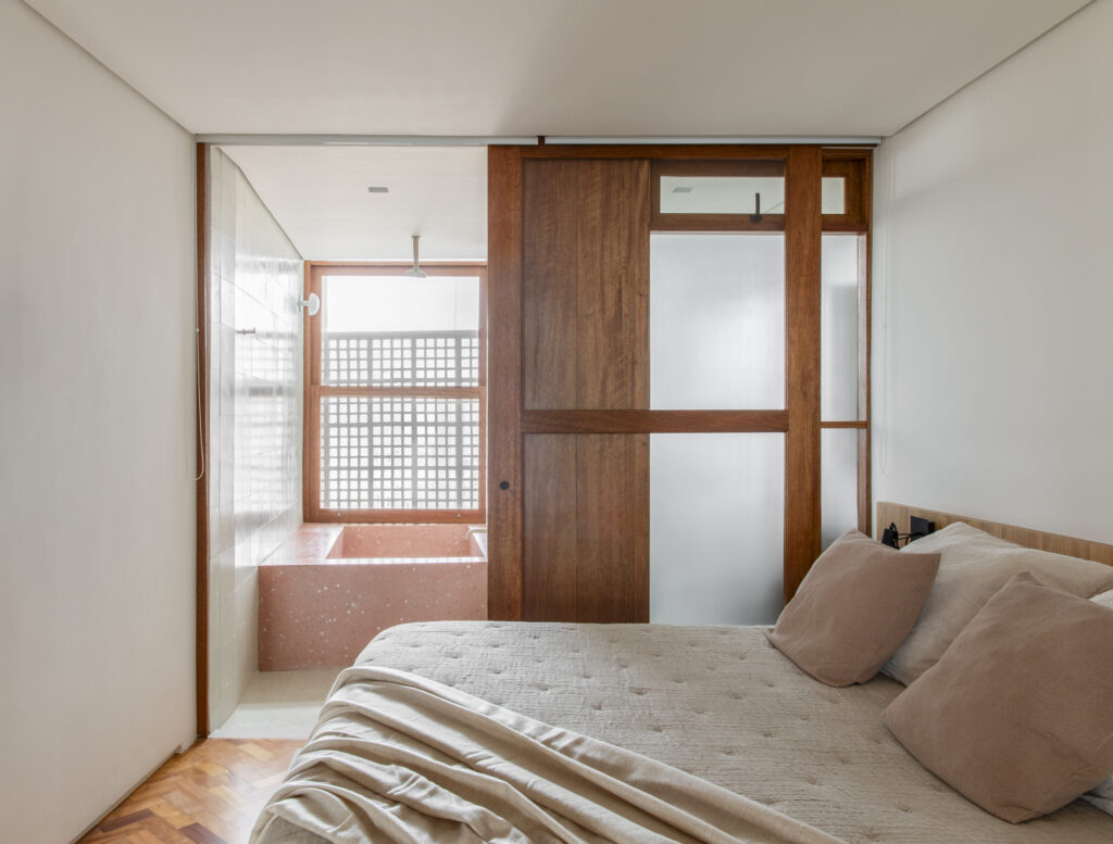 Versátil por natureza, o atelier surge como um espaço mutável, capaz de se transformar futuramente numa suíte. Já o quarto principal estabelece uma relação mais permeável com a casa de banho, separado por caixilharias de madeira e vidro que permitem a entrada de luz natural e promovem a ventilação cruzada. Neste ambiente, a banheira e a bancada em betão pré-fabricado reafirmam a materialidade que norteia o projeto.