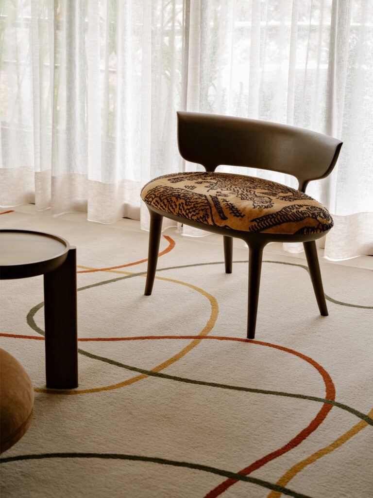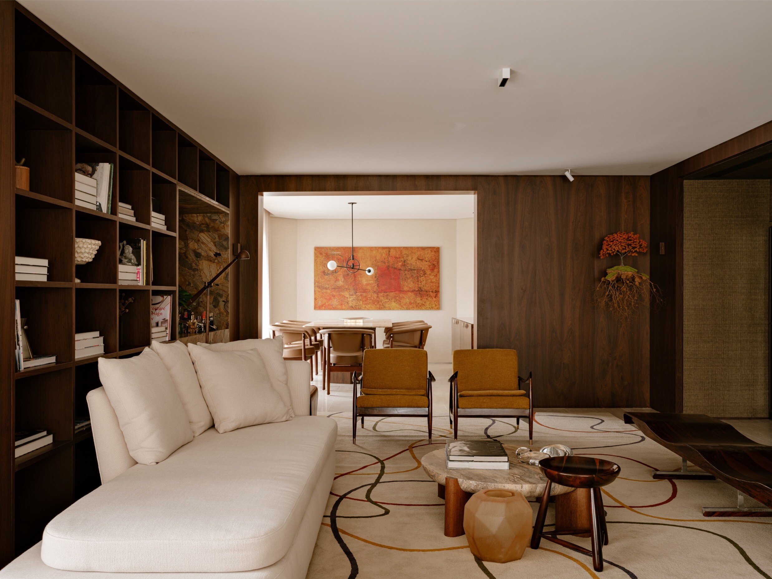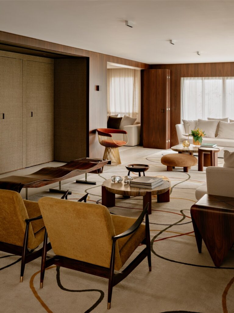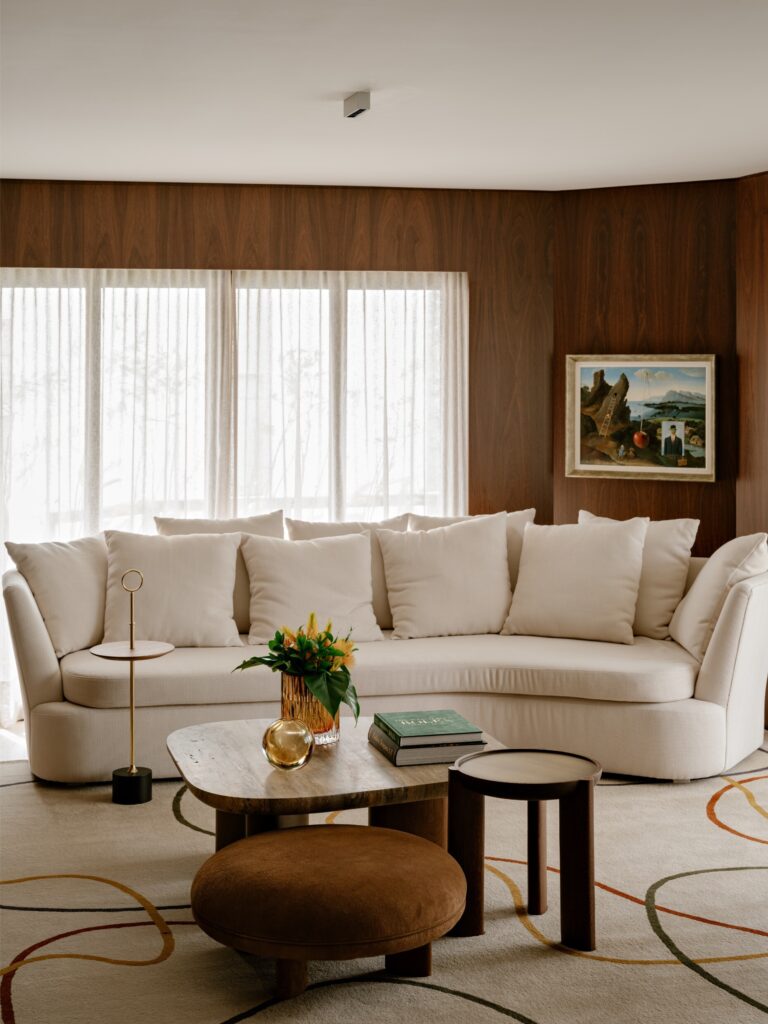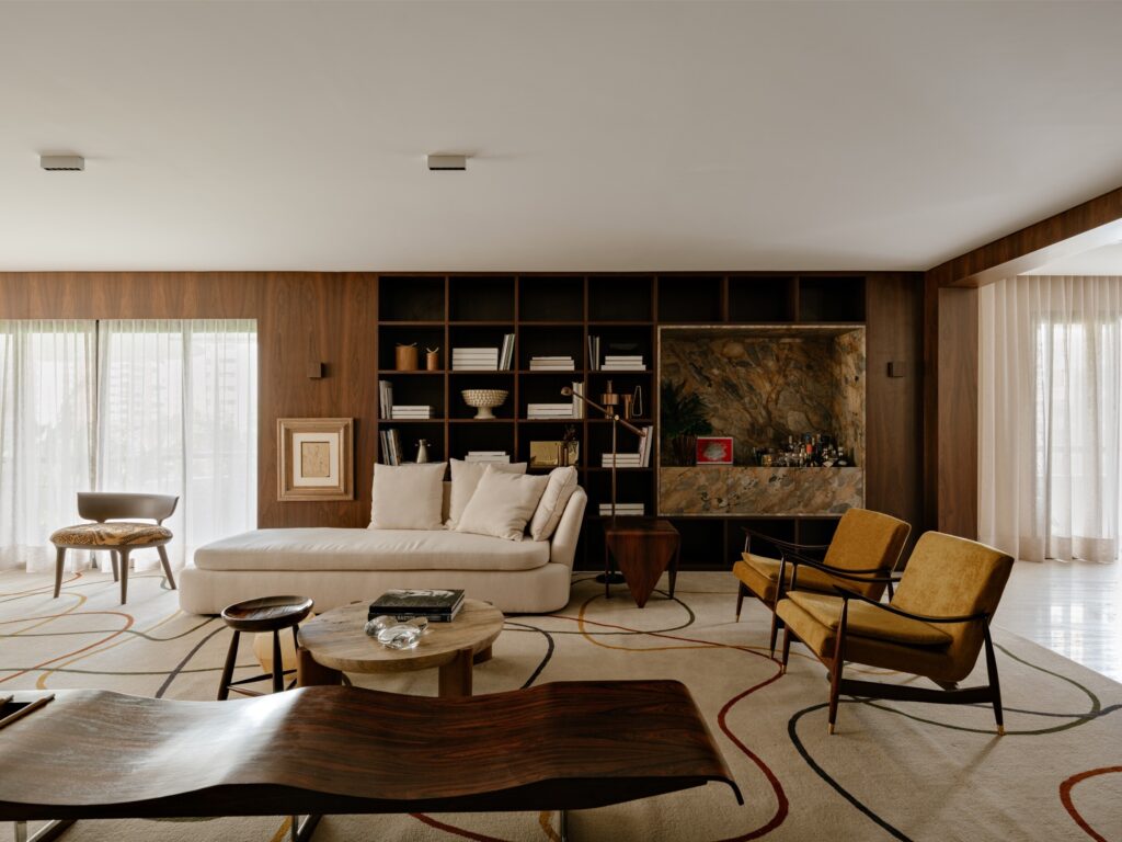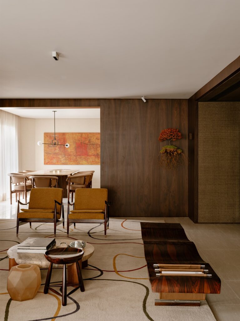 Entre os destaques, surgem nomes incontornáveis como Jorge Zalszupin e Sergio Rodrigues, ao lado de autores contemporâneos como Jader Almeida e Isabelle de Mari. Mesas, poltronas e peças de apoio compõem um cenário onde o design é vivido e não apenas exibido. Os tapetes Punto e Filo ajudam a unificar visualmente os ambientes, funcionando como elementos de transição.