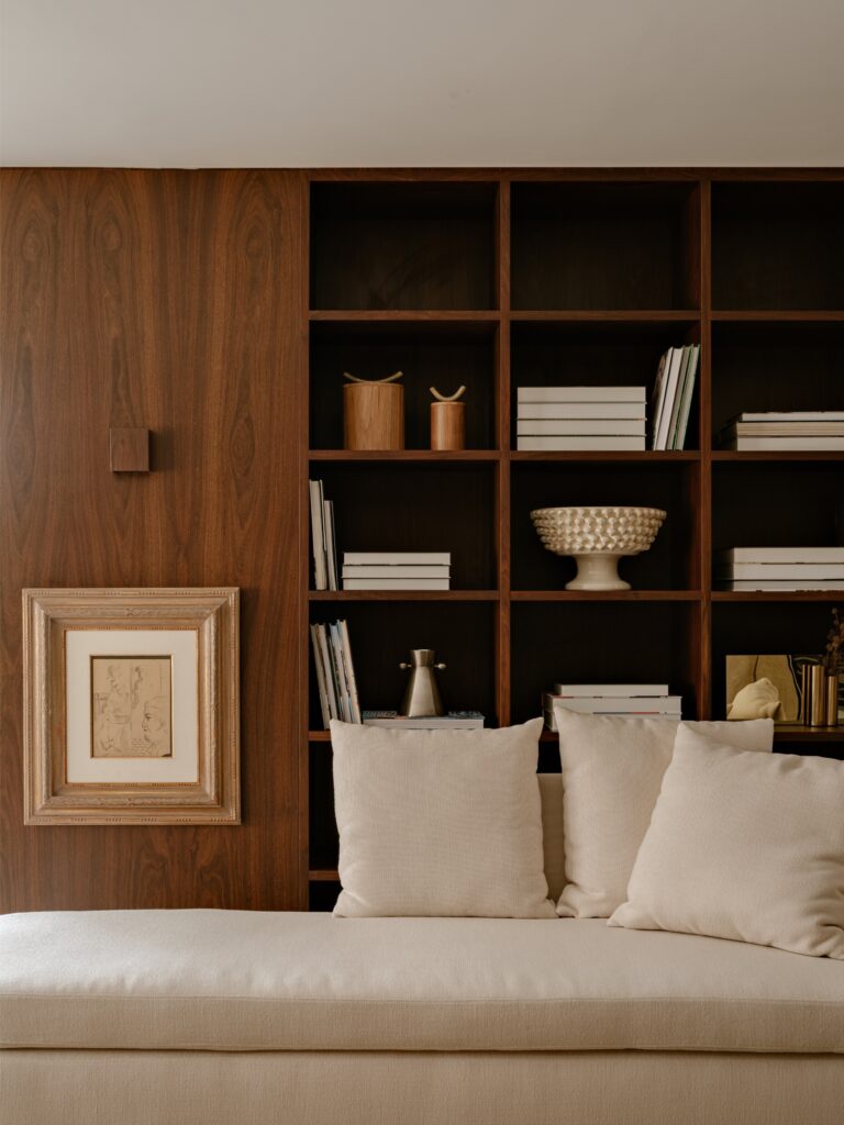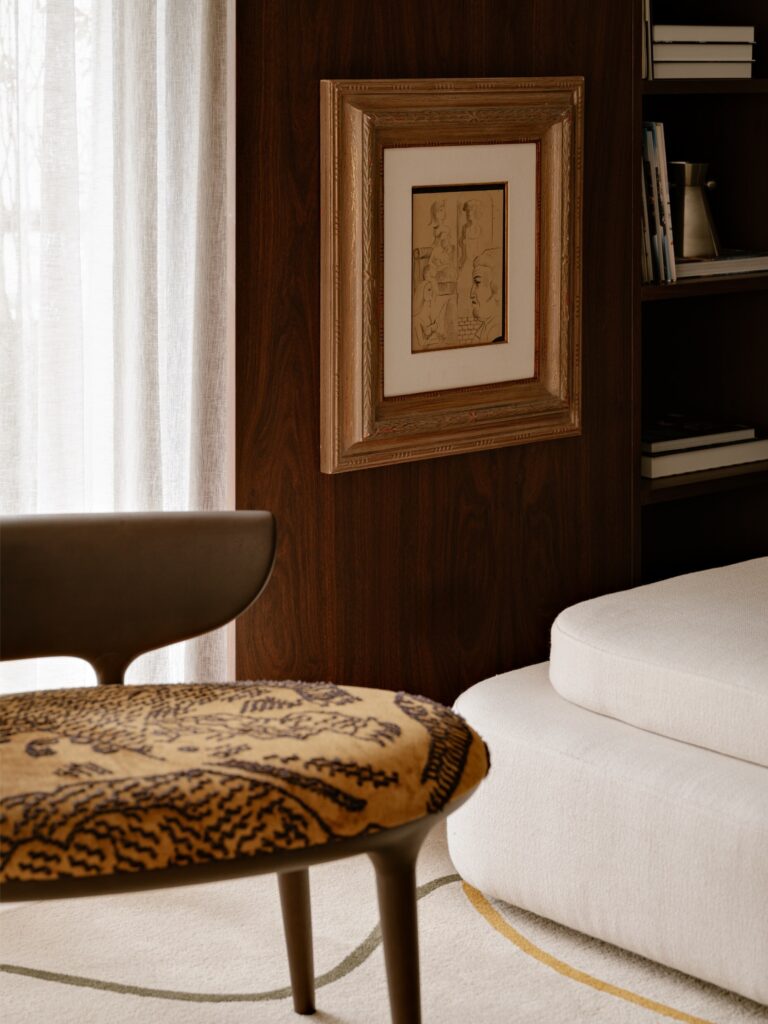 A madeira reveste as paredes e envolve o espaço social, criando uma atmosfera quente e contínua. No hall de entrada, o revestimento em palha de seda verde de Nani Chinelato antecipa subtilmente a paleta cromática do projecto. A cor surge de forma indirecta, revelando-se nas fibras naturais, nos tecidos, nos tapetes e nos tons amarelados das pedras.
