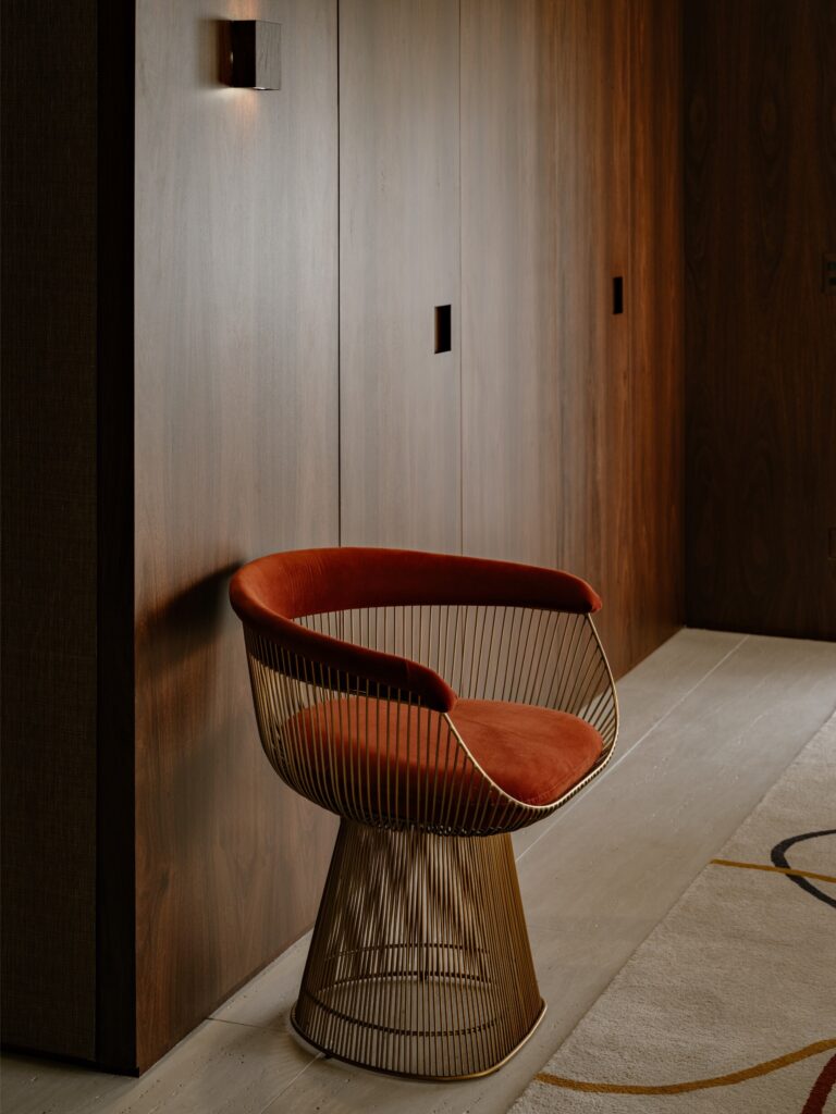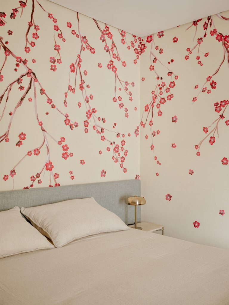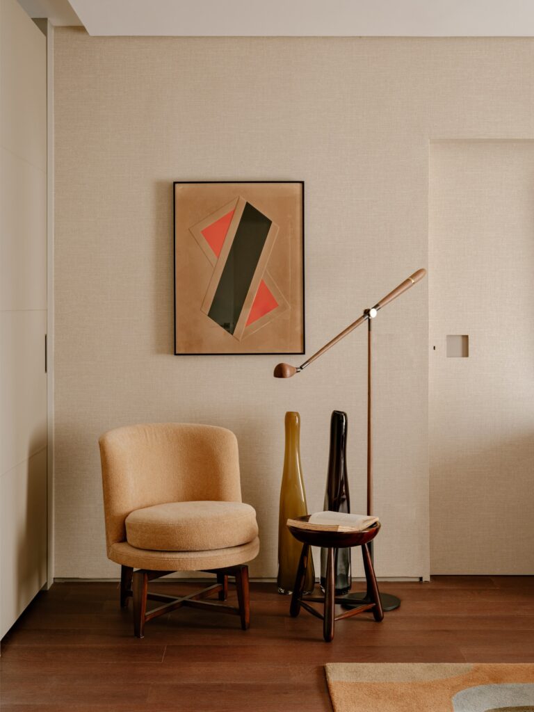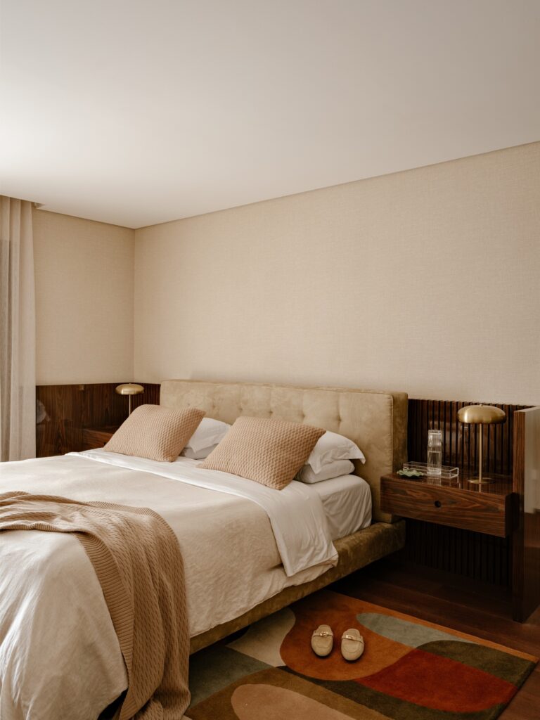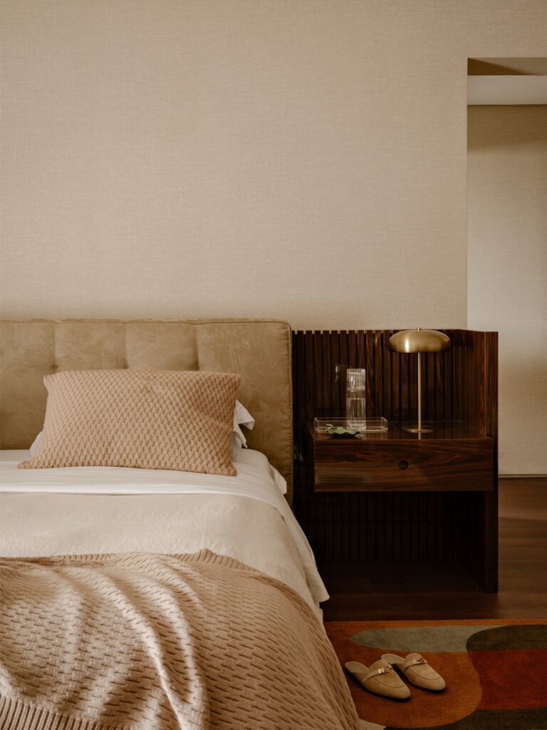 Na suíte principal, o piso em madeira escura contrasta com as paredes claras revestidas a papel, enquanto a marcenaria em louro-preto prolonga o tom do chão, criando um equilíbrio subtil entre sobriedade e conforto. Um tapete colorido introduz leveza e quebra a contenção cromática, em diálogo com os tecidos e com uma iluminação suave.