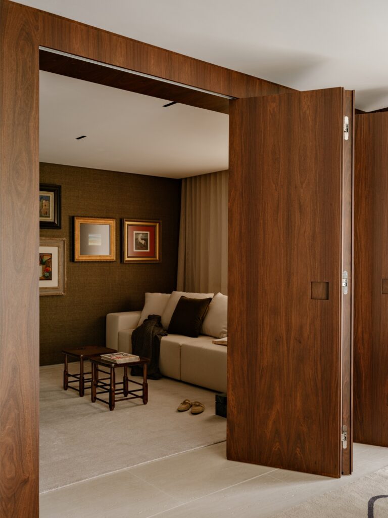 As características originais do edifício foram assumidas como matéria de projecto, integradas numa narrativa espacial coerente. Na área social, um recorte acolhe uma estante em madeira de ipê, que incorpora um bar e um nicho em quartzito Via Appia. Em contraponto, o sofá acompanha a geometria do espaço, diluindo fronteiras entre a zona de estar e o home cinema, que pode ser isolado ou integrado através de uma porta camarão.