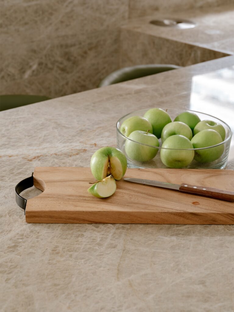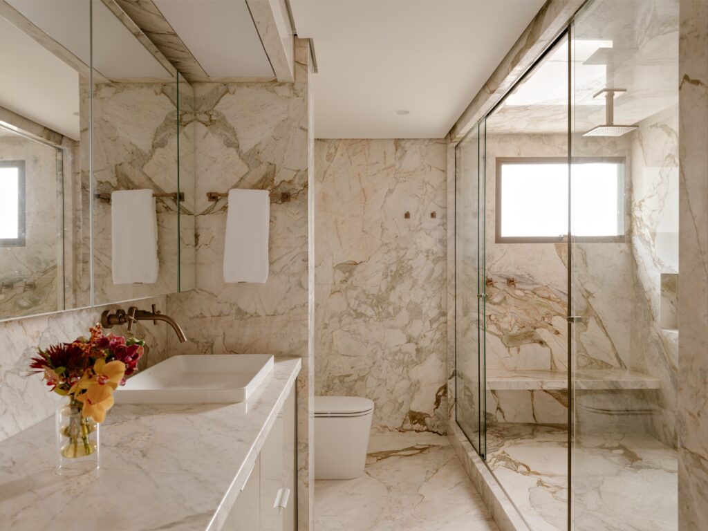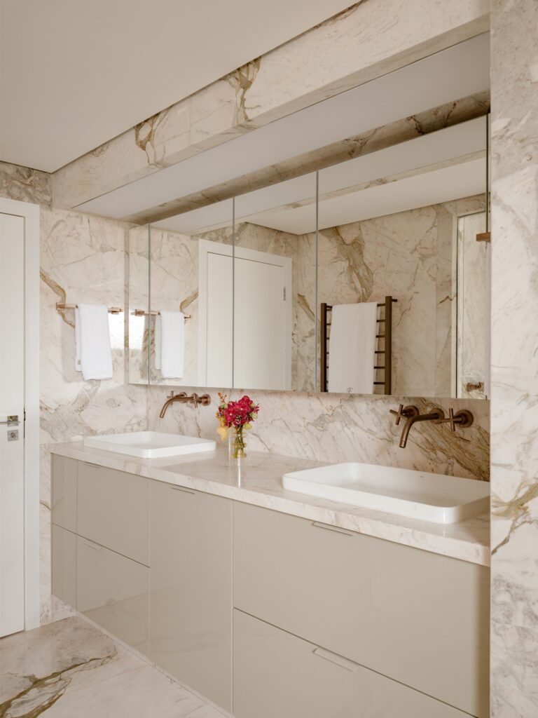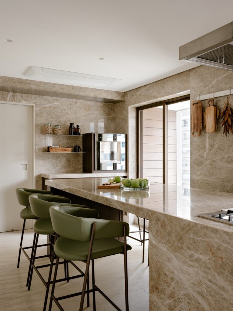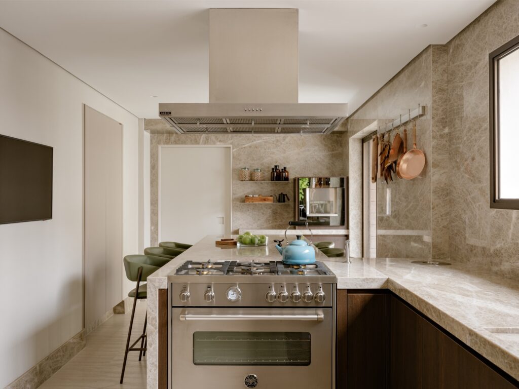 A cozinha, desejo central da moradora — psicóloga de profissão e cozinheira por prazer — foi totalmente integrada, tornando-se o coração da casa. A linguagem da marcenaria mantém-se coerente com a área social, enquanto o quartzito Taj Mahal nas bancadas e paredes reforça a unidade visual.