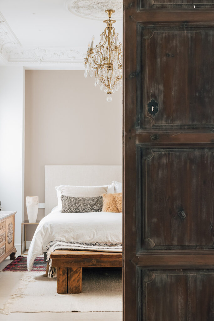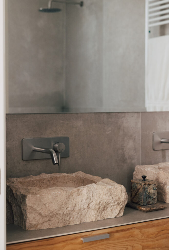 A materialidade equilibra elementos contemporâneos com peças recuperadas. Portas interiores e lavatórios em pedra provenientes de demolições foram criteriosamente selecionados, restaurados e readaptados, fragmentos de outras casas que aqui iniciam nova vida. A iluminação, assinada pela Arkoslight, integra-se de forma discreta, sublinhando sem competir e deixando à luz natural o papel principal.