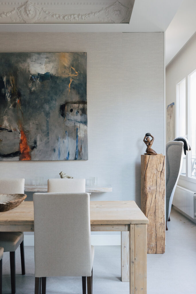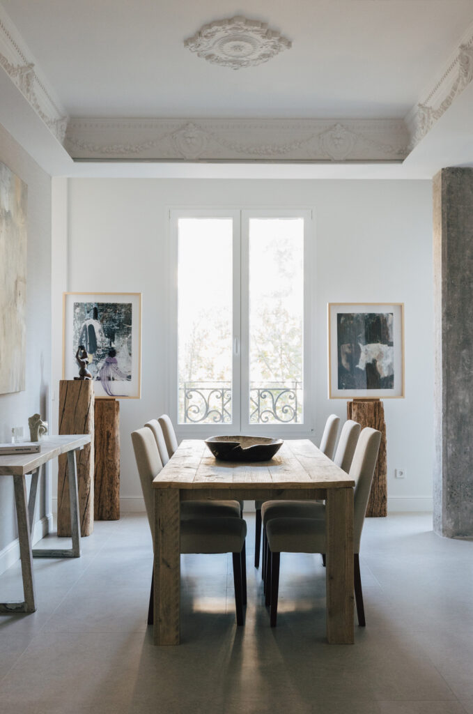 Do lado oposto, a sala desenvolve-se através de elementos divisórios que não tocam o teto, estratégia que preserva a continuidade da luz e a perceção de amplitude, ao mesmo tempo que cria ambientes distintos. A grande mesa de jantar assume o protagonismo. Junto a ela, um pequeno salão inspirado no efeito de gruta oferece um contraponto íntimo e resguardado, pensado para momentos a dois ou encontros mais próximos.