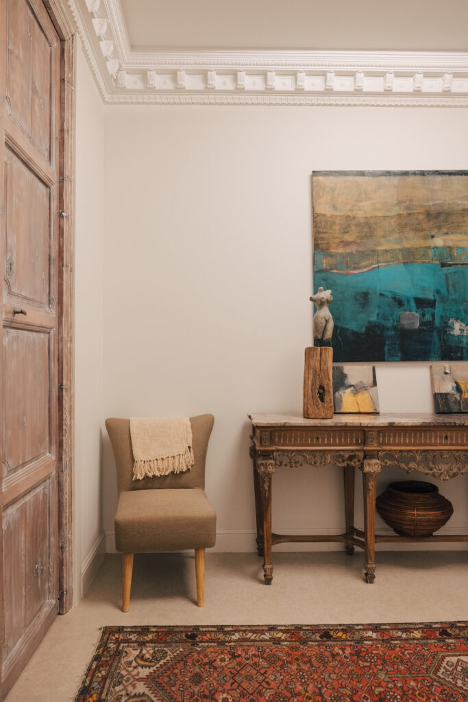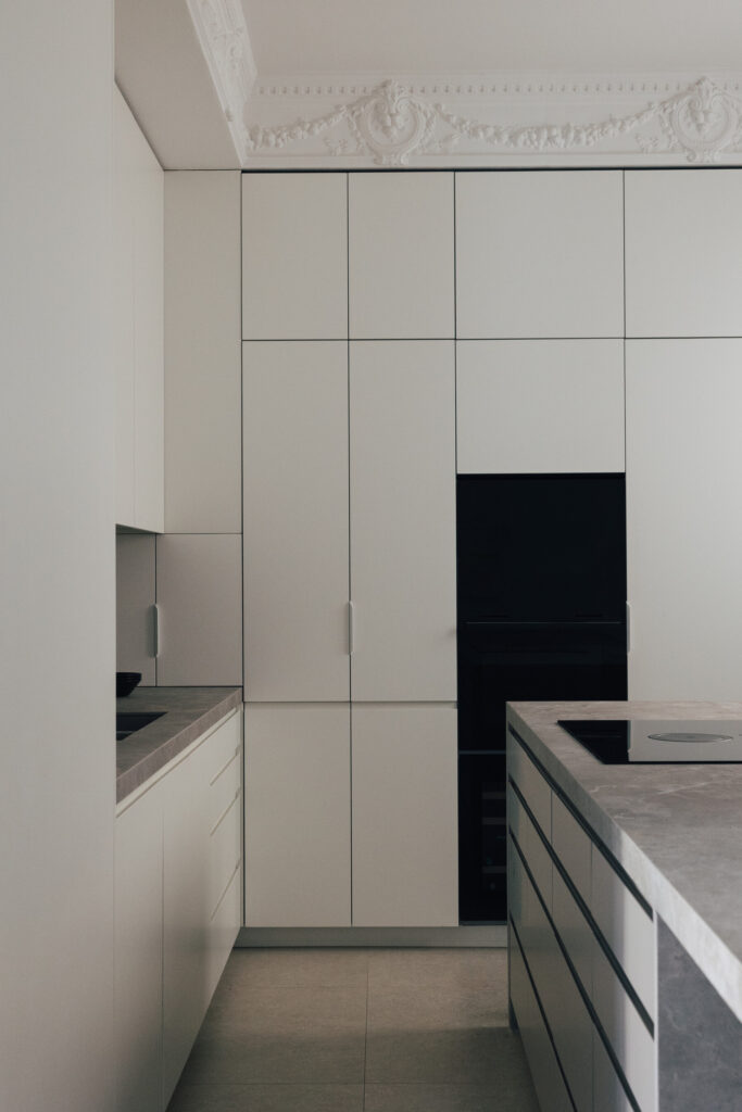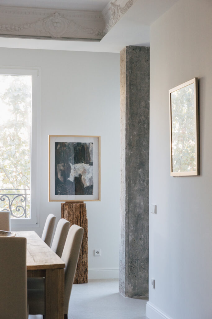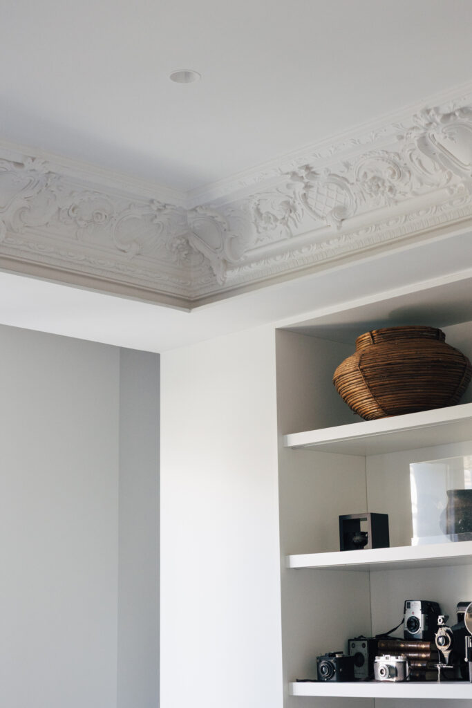 As molduras assumem papel central. A necessidade de instalar ar condicionado por condutas implicou refazer o teto falso, oportunidade que o estúdio aproveitou para ganhar altura e introduzir perfis de maior escala, agora reinterpretados numa linguagem contemporânea e integrados na carpintaria desenhada à medida, reforçando a coerência do conjunto.