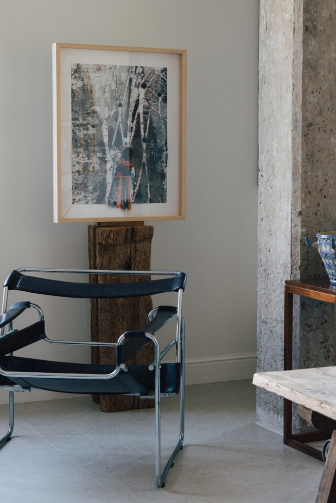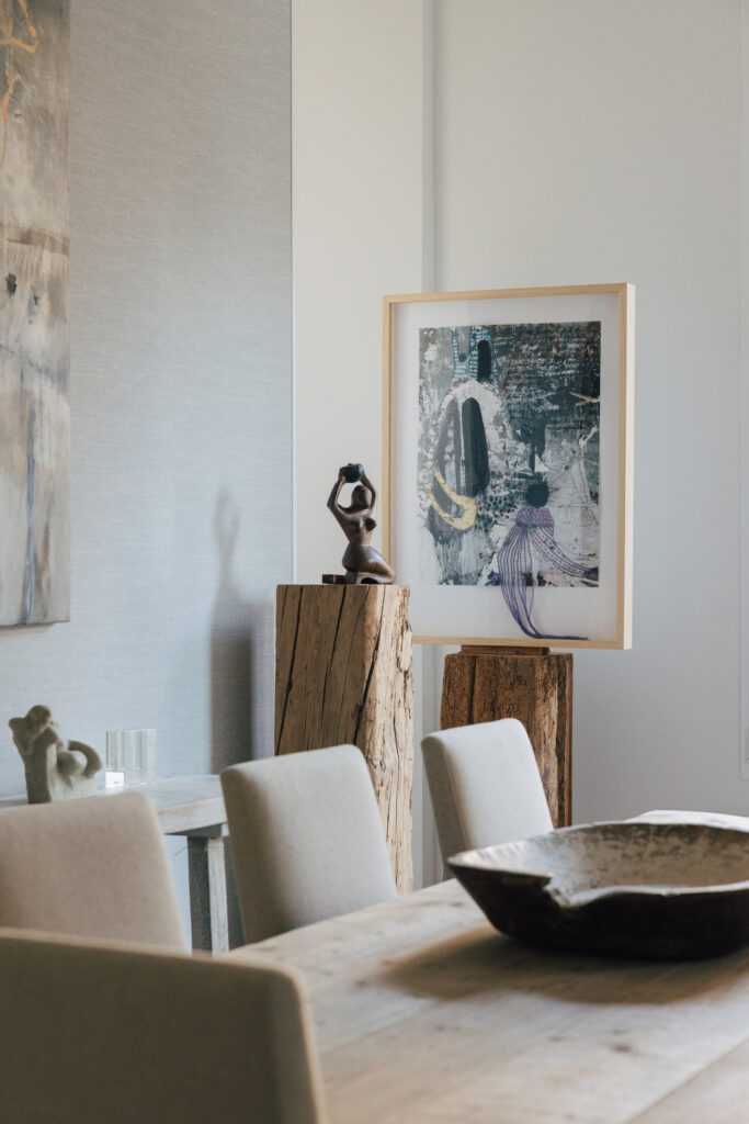 A linguagem estética define-se como um “minimalismo com alma e propósito”, conciliando depuração formal com densidade emocional. A paleta cromática, de brancos e cinzas, evoca a tela em branco enfrentada por qualquer criador, permitindo que a arquitetura se dilua e que obras de arte, fotografias e peças trazidas do Chile ou adquiridas ao longo da vida encontrem o seu lugar com naturalidade.