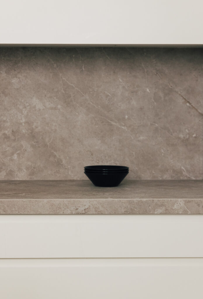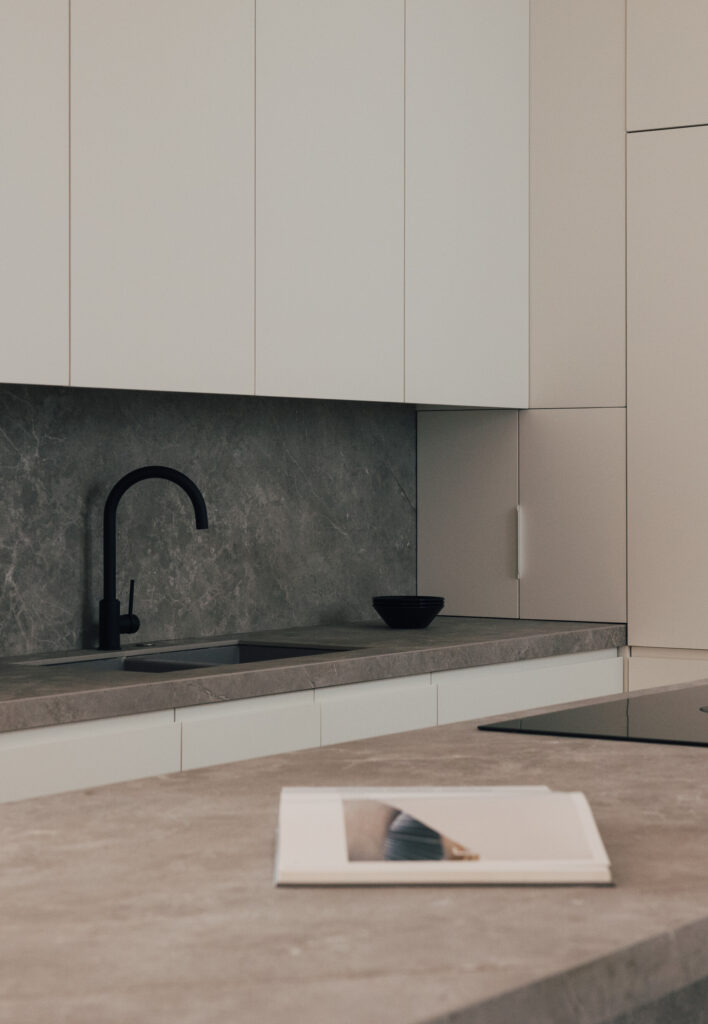 A entrada faz-se por um acesso amplo que conduz a um corredor de teto abobadado, orientando o olhar até à cozinha. Generosa e inundada de luz, organiza-se em torno de uma grande ilha central que convida a cozinhar e a partilhar refeições sem pressa — uma ponte subtil entre a tradição americana da cozinha como coração da casa e o ritmo pausado do viver mediterrânico. Uma lavandaria oculta, escondida por uma porta de correr, mantém a pureza visual do espaço.