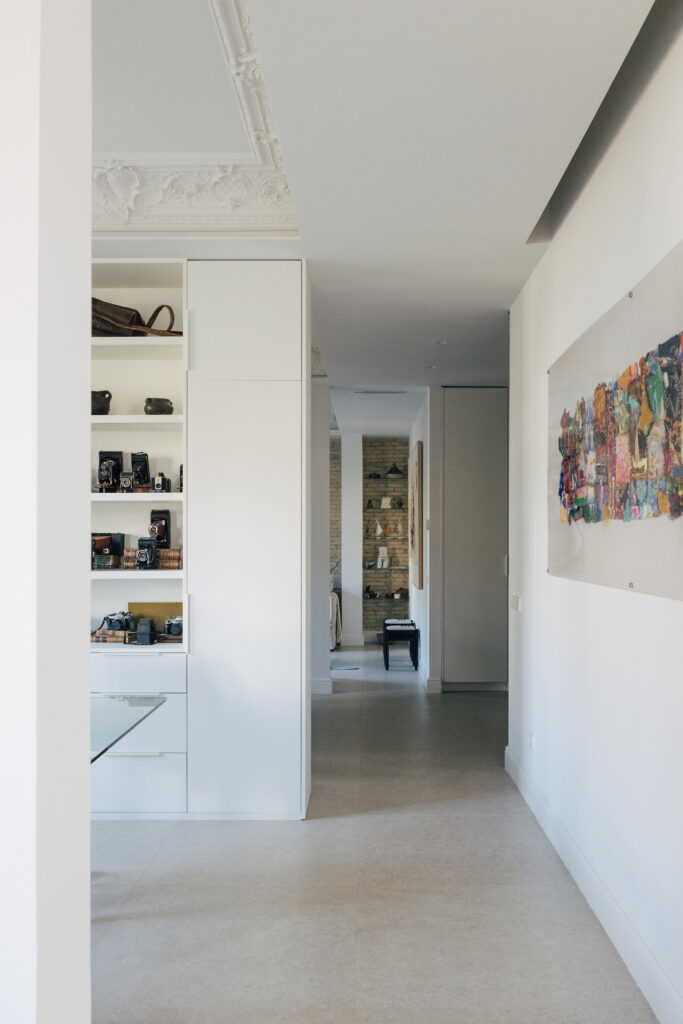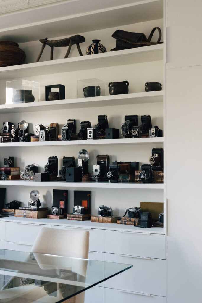 À esquerda, um primeiro escritório aberto expõe, num móvel desenhado à medida, a coleção de câmaras fotográficas de Emma Sepúlveda. Um segundo volume separa este espaço da zona de estar e televisão, igualmente ampla e sem fechos visuais. Duas portas recuperadas de demolições marcam este ambiente e conduzem ao escritório privado da autora, um lugar de recolhimento indispensável ao seu processo criativo.