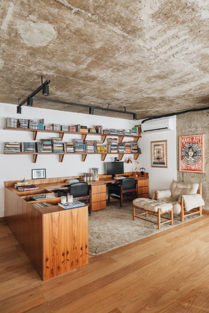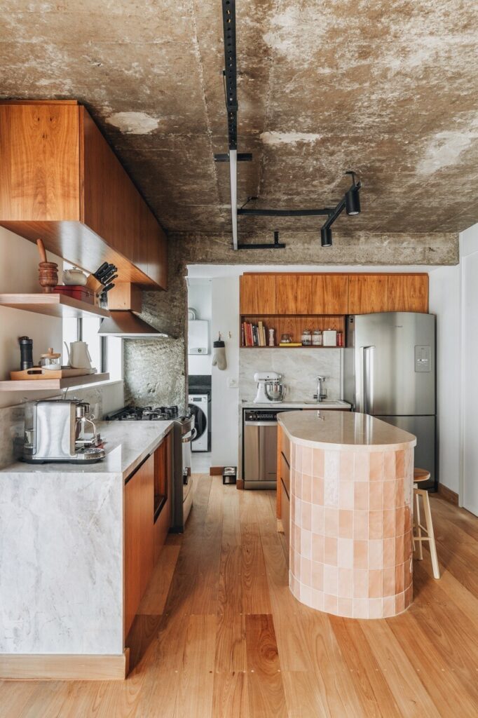 A estrutura em betão aparente, exposta em pilares, vigas e laje, é a melhor guardiã da memória deste edifício. A sua presença forte, quase bruta, acentua o caráter do apartamento de 98 m², com projeto do ateliê FJ55 Arquitetura. As fotografias são de André Mortatti. Veja mais aqui.