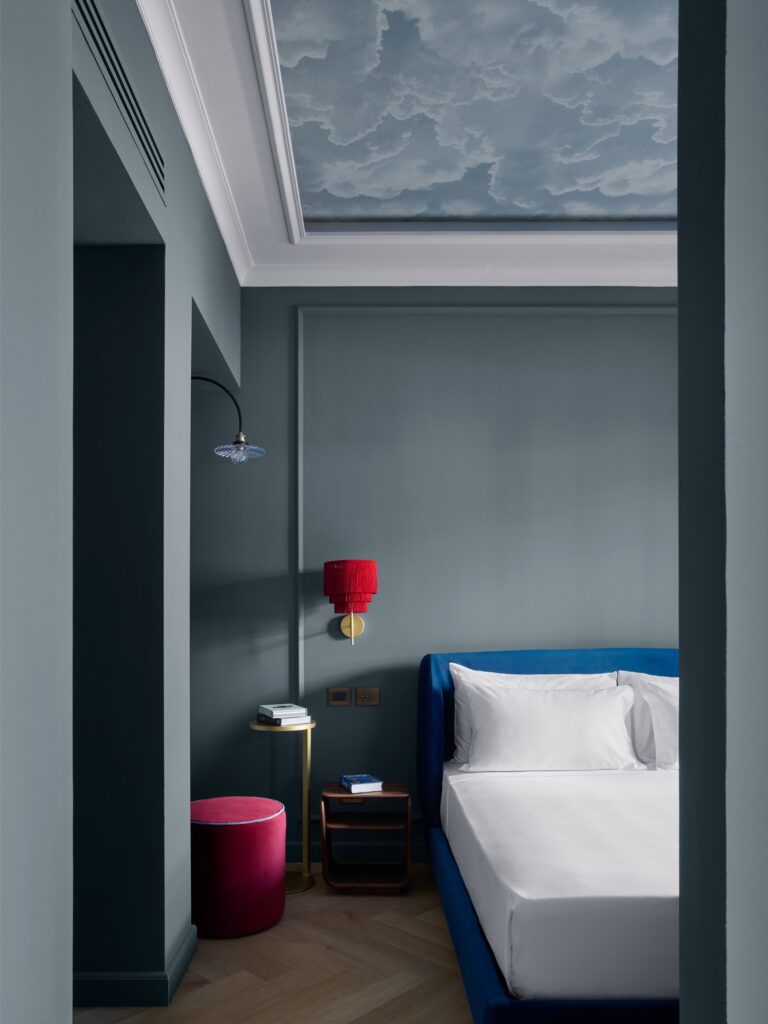 Nos interiores, o rigor neoclássico é suavizado por uma linguagem mais atmosférica e sensorial: paletas em azul suave, texturas tácteis e formas escultóricas criam uma narrativa visual subtilmente surreal. Este conceito atinge o seu ponto mais expressivo nos quartos, onde os tectos decorados com nuvens reinterpretam a tradição italiana dos frescos através de uma abordagem gráfica contemporânea. Carpintarias personalizadas, pedra natural e detalhes em latão escovado contribuem para uma estética coesa, enquanto apontamentos cromáticos — como pufes em tom carmim — introduzem contraste e ritmo.