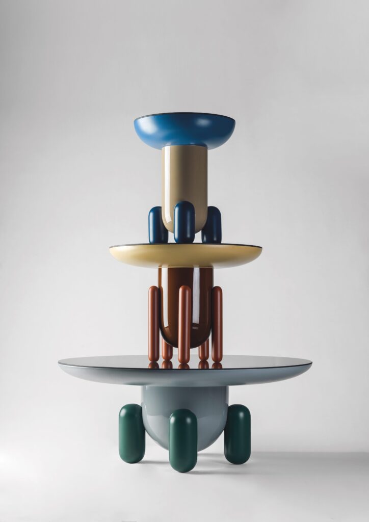 5. Mesas Explorer, por Jaime Hayón para a BD Barcelona, corpo em fibra de vidro lacada, pernas em madeira maciça torneada e lacada e tampo em vidro pintado. Na QuartoSala.