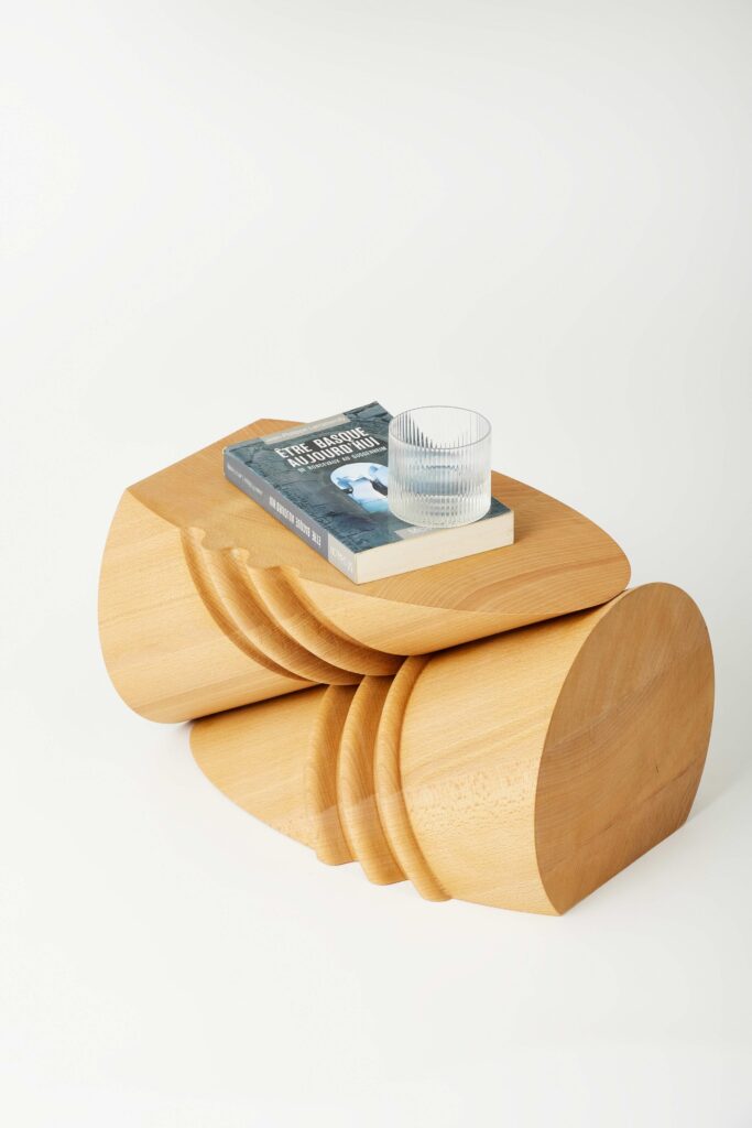 7. Mesa de centro Re-Form, da Wewood, ecoa a essência da criação e da transformação.
