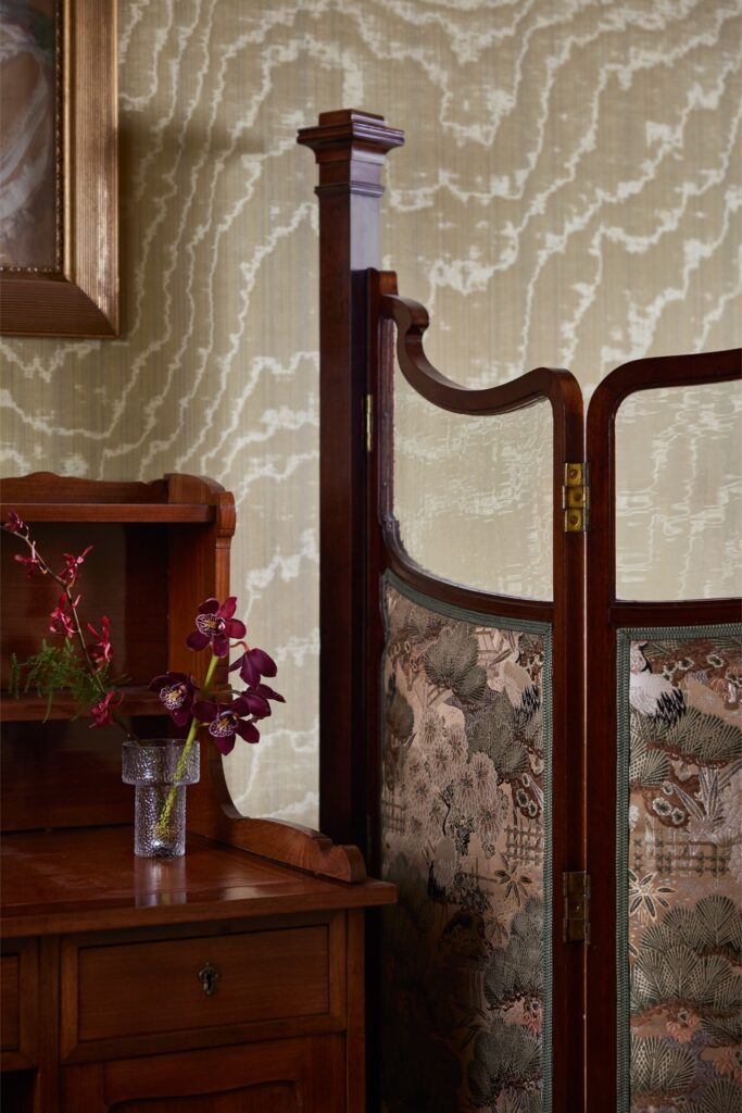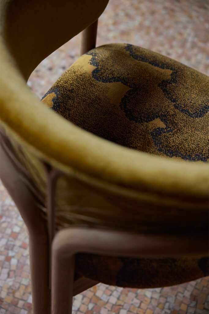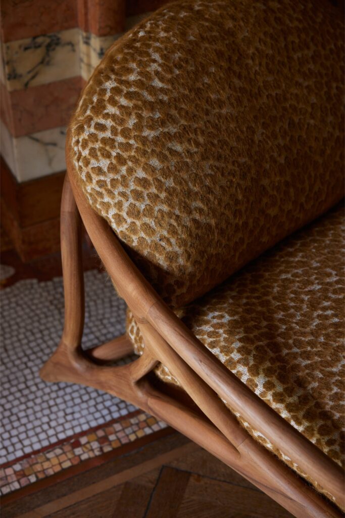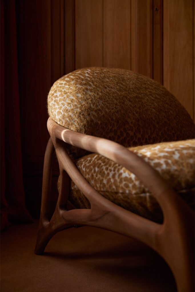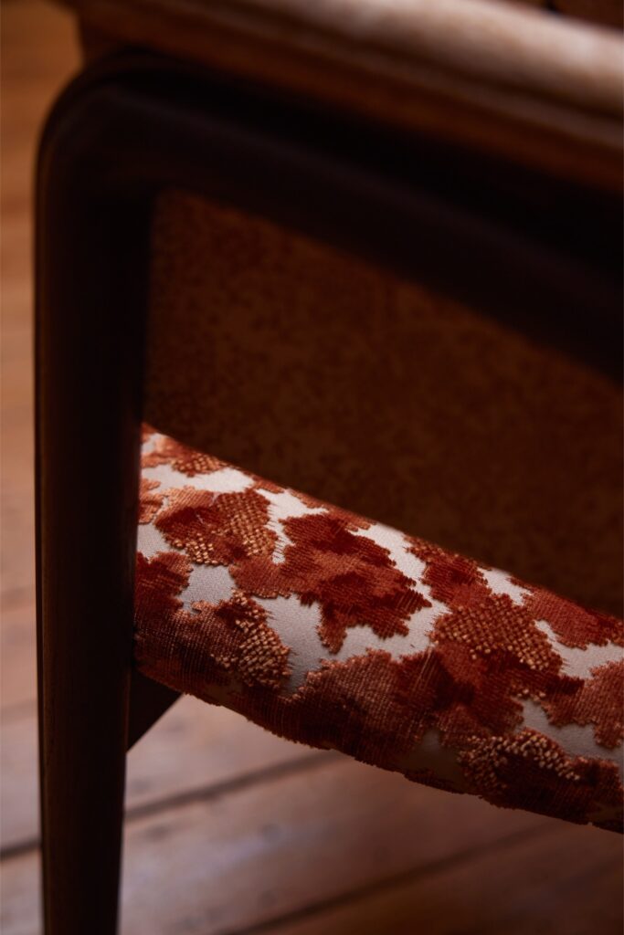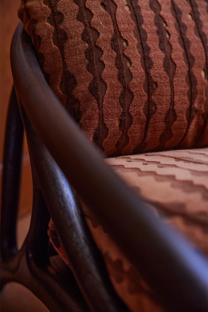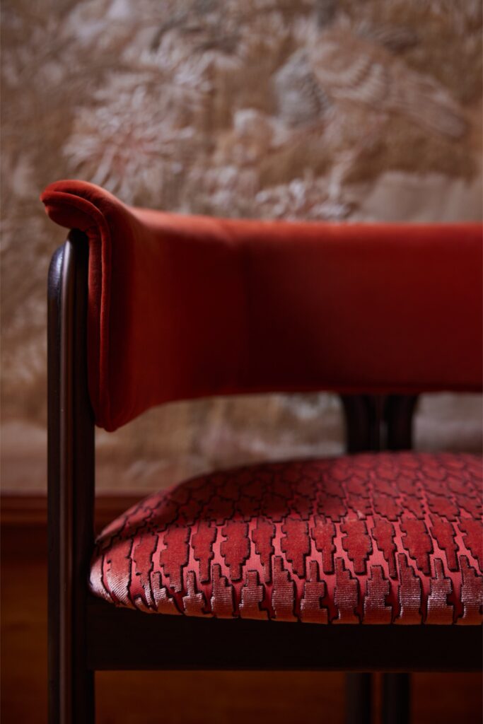 Para esta ocasião, peças selecionadas foram cuidadosamente adaptadas ao contexto envolvente. Os tecidos foram escolhidos divisão a divisão, garantindo que cada tom e textura complementavam os materiais existentes na casa. Ocres quentes, vermelhos profundos e padrões naturais subtis criam uma continuidade visual intrinsecamente ligada ao espaço. A seleção têxtil inclui tecidos da Elitis e Pierre Frey, bem como Guillin, da coleção Dieter Vander Velpen x Zinc, reforçando a qualidade intemporal e tátil que está no centro da estética da Morpho.