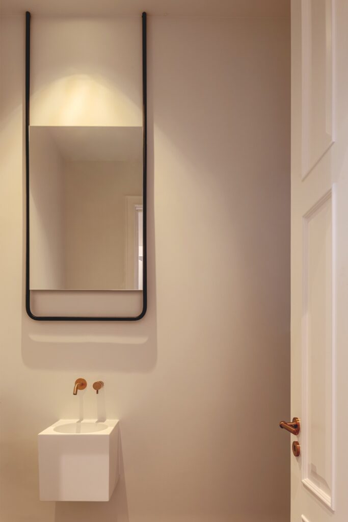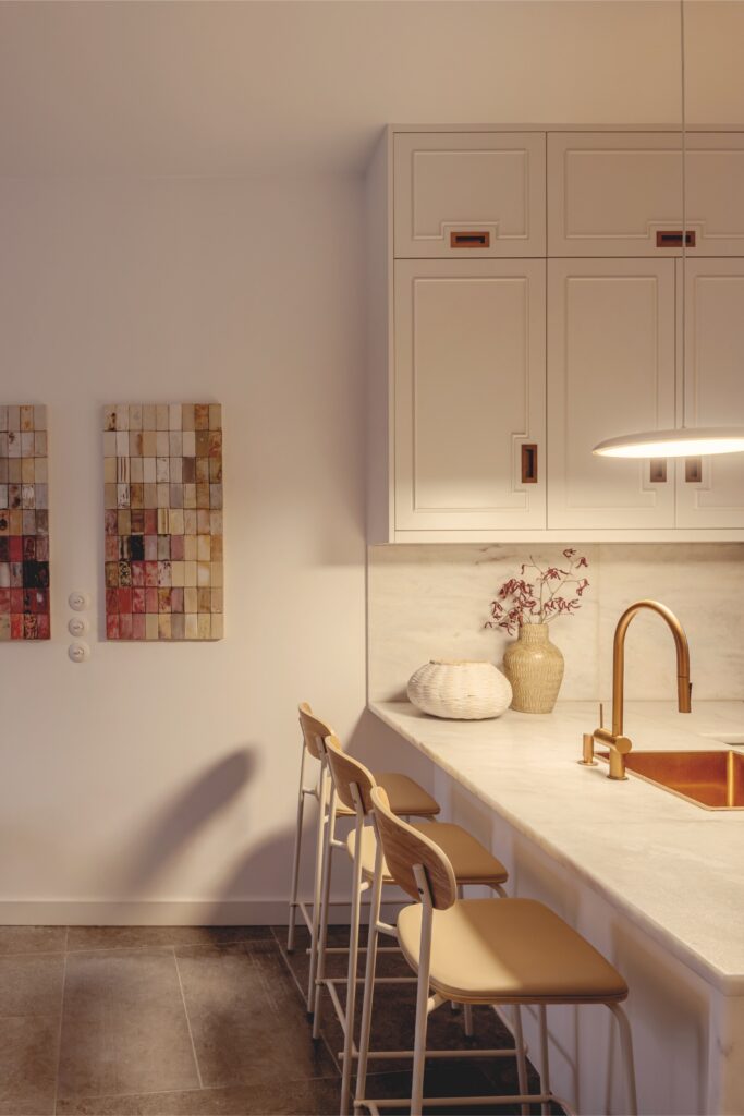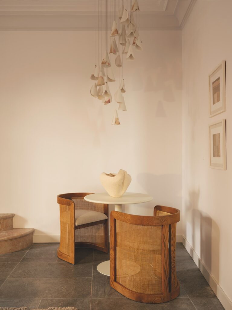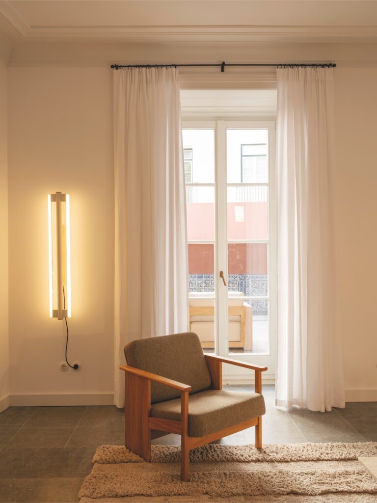 A iluminação foi desenhada para oferecer camadas de experiência: luz funcional nos tetos e uma atmosfera mais intimista criada por candeeiros de pé. Como contraponto ao registo orgânico dominante, um aplique de carácter industrial do duo dinamarquês Kroyer-Saetter-Lassen introduz tensão estética e afirma-se como peça-statement.
