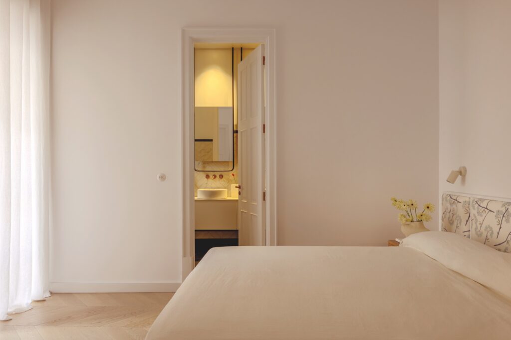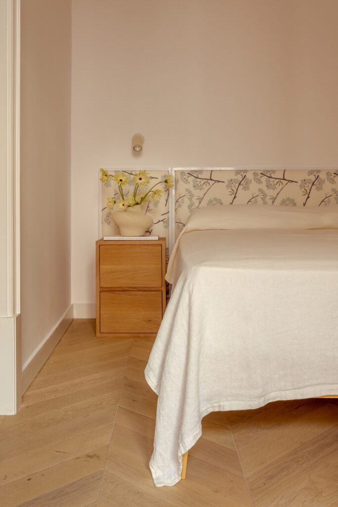 O mobiliário combina peças maioritariamente adquiridas, de marcas como Ferm Living, Form & Refine, Westwing e Area Store, com elementos feitos por medida, como a cabeceira do quarto principal, onde se cumpre o briefing de um minimalismo com ligeira inspiração asiática.