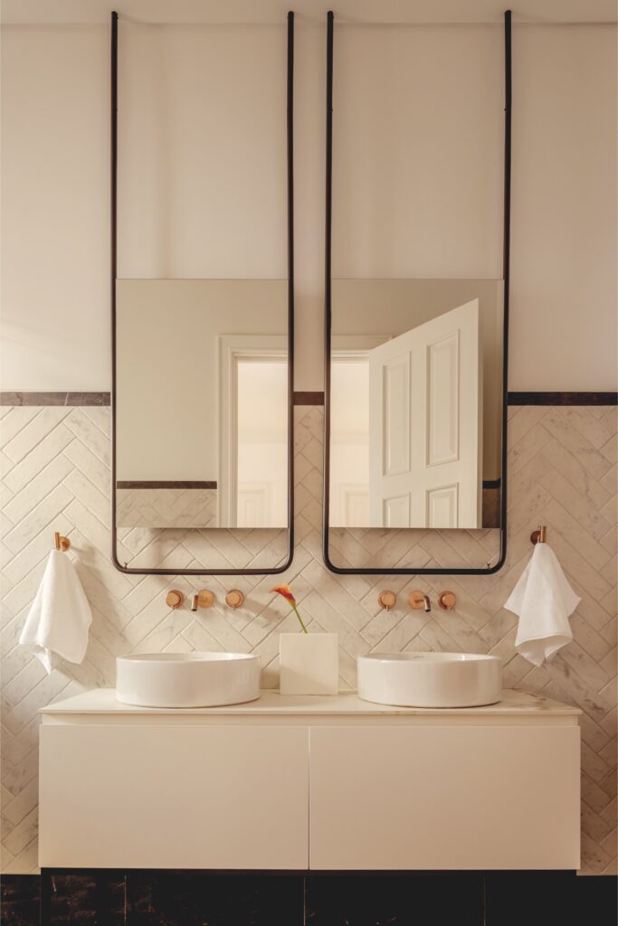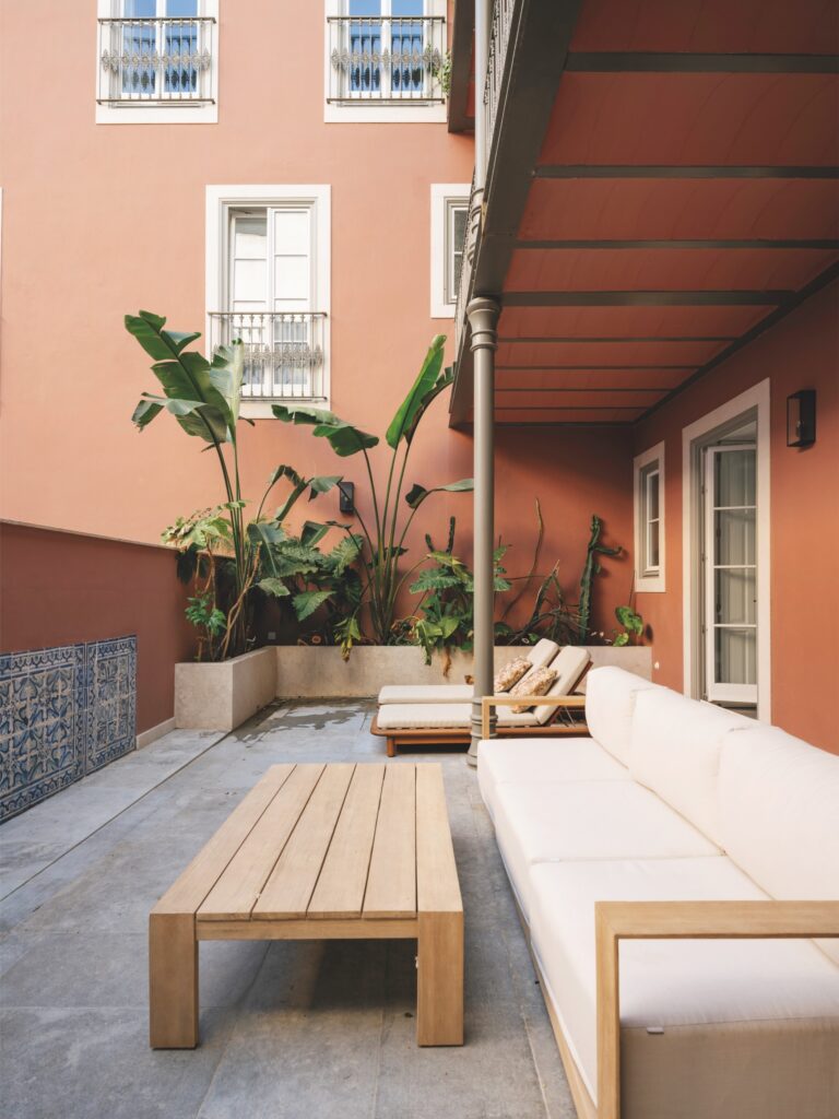 A casa revela-se hoje como um exercício de sofisticação orgânica. Destacam-se elementos como portas e guardas em ferro preto, ferragens em cobre, escadas de entrada em mármore rosa de desenho curvo, que evocam referências Art Déco, pavimentos em pedra natural e apontamentos exteriores em azulejo português. O conjunto material cria uma base rica e texturada sobre a qual assenta o conceito decorativo.
