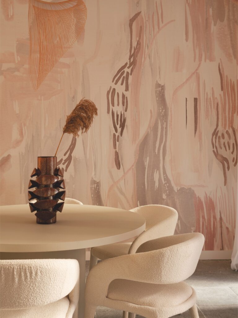 O conceito estético, enquadrado no universo Organic Modern, cruza neutralidade e expressão artística. A paleta desenvolve-se em tons pastéis suaves, inspirados nos pores-do-sol de Lisboa, pontuados por discretos apontamentos de azul. A distribuição cromática foi cuidadosamente equilibrada numa proporção de 70% de neutros e 30% de cor, garantindo serenidade visual sem perder profundidade.