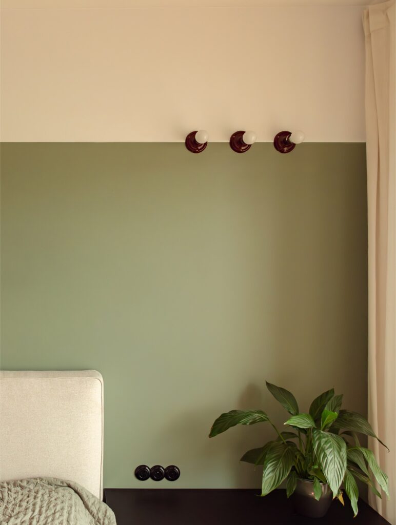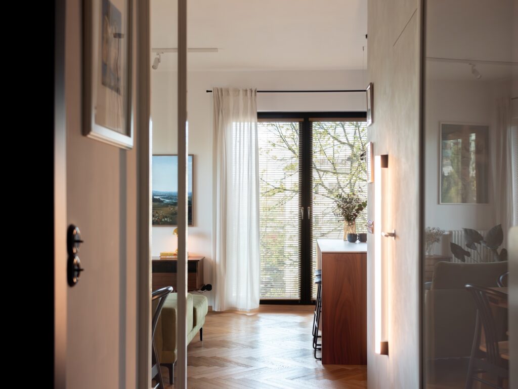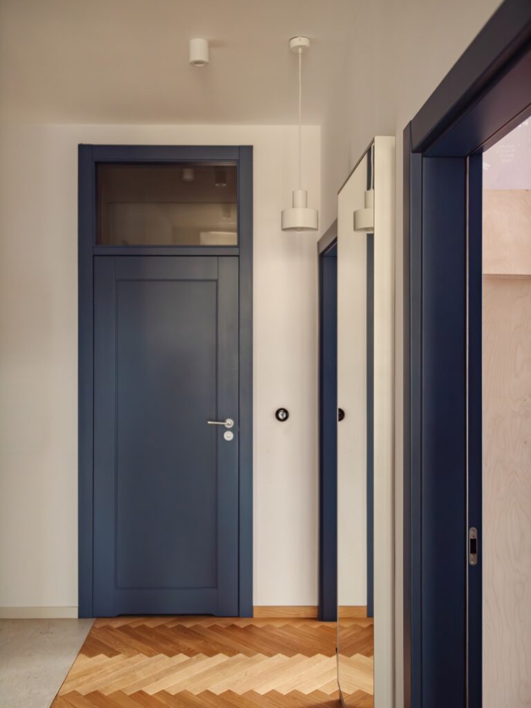 O apartamento é dominado por uma paleta cromática quente: soalho em carvalho cor de mel, folheado de nogueira na cozinha e um sofá verde. Esta paleta é complementada por um tom índigo rico e profundo, presente tanto na cozinha como em todas as portas interiores.